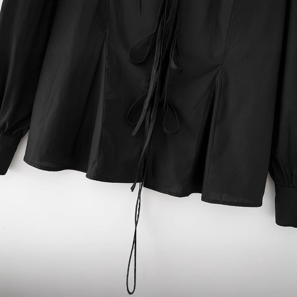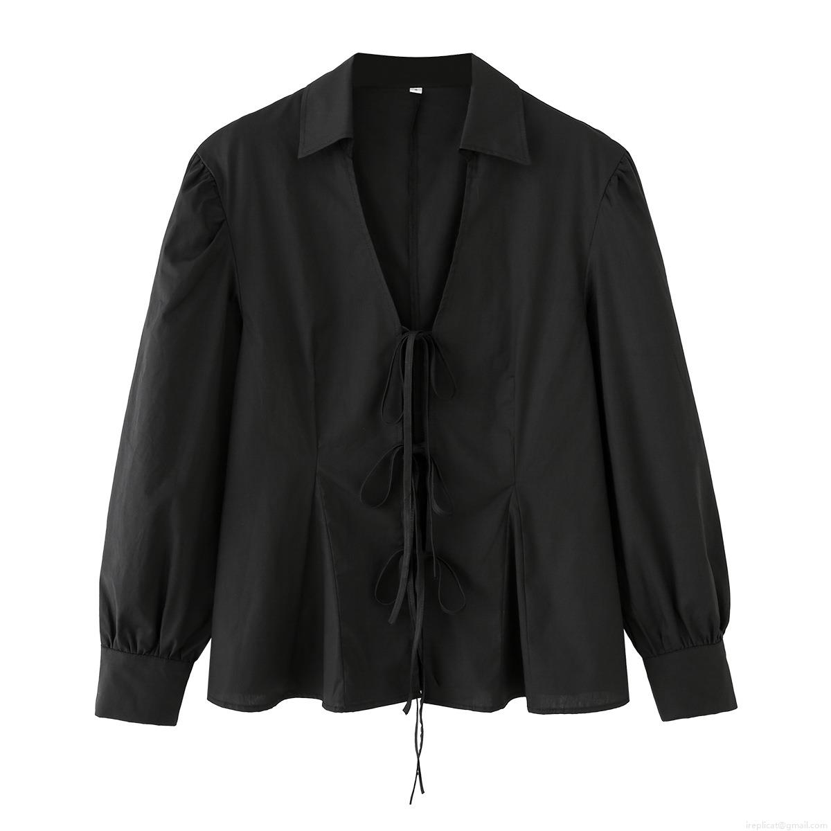 • Women's French Retro 100% Cotton Poplin Blouse Deep V-Neck Bow Tie Front Long Sleeve Shirt Slim Fit Waist Solid Color Casual Elegant Top