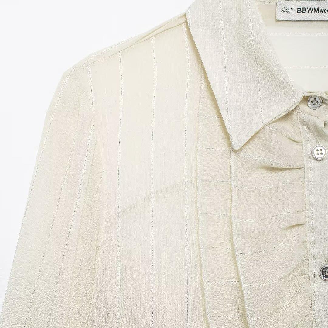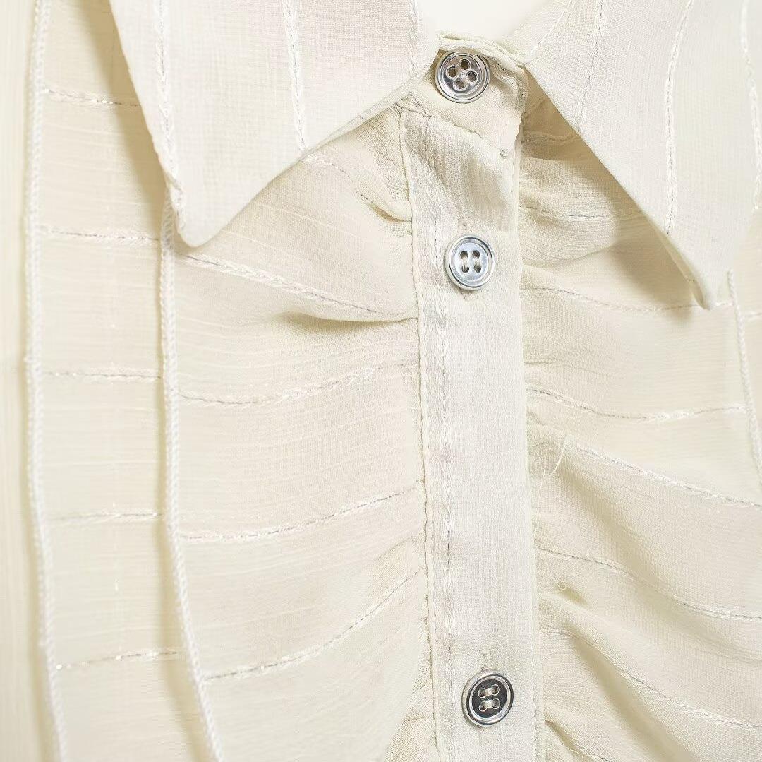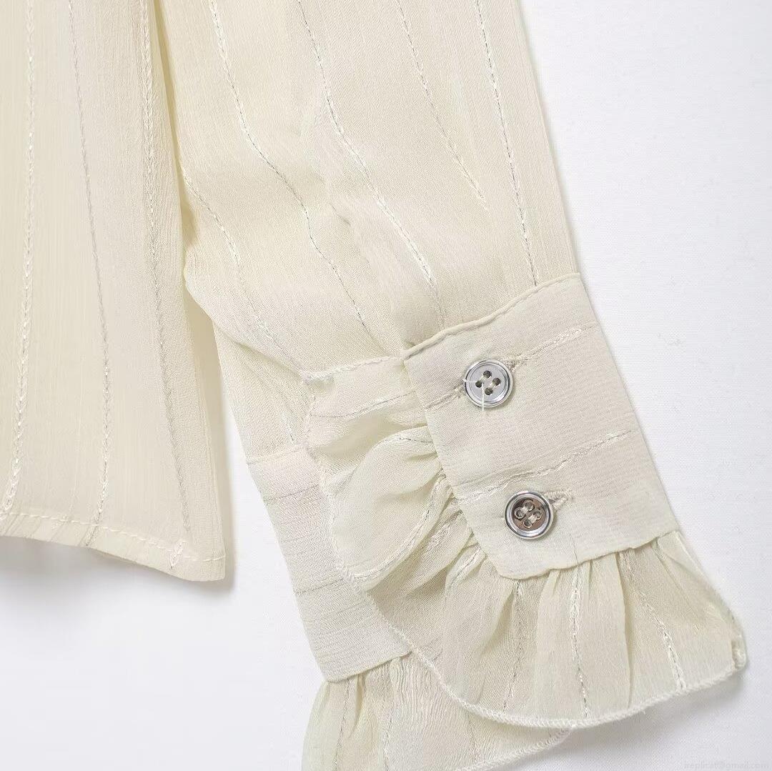 • Women's French Romantic Ivory White Blouse 100% Polyester Vertical Striped Texture Shirt Frill Ruffle Collar Long Sleeve Top For Daily Office Elegant Casual Chic Apparel