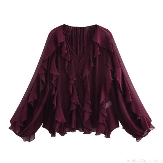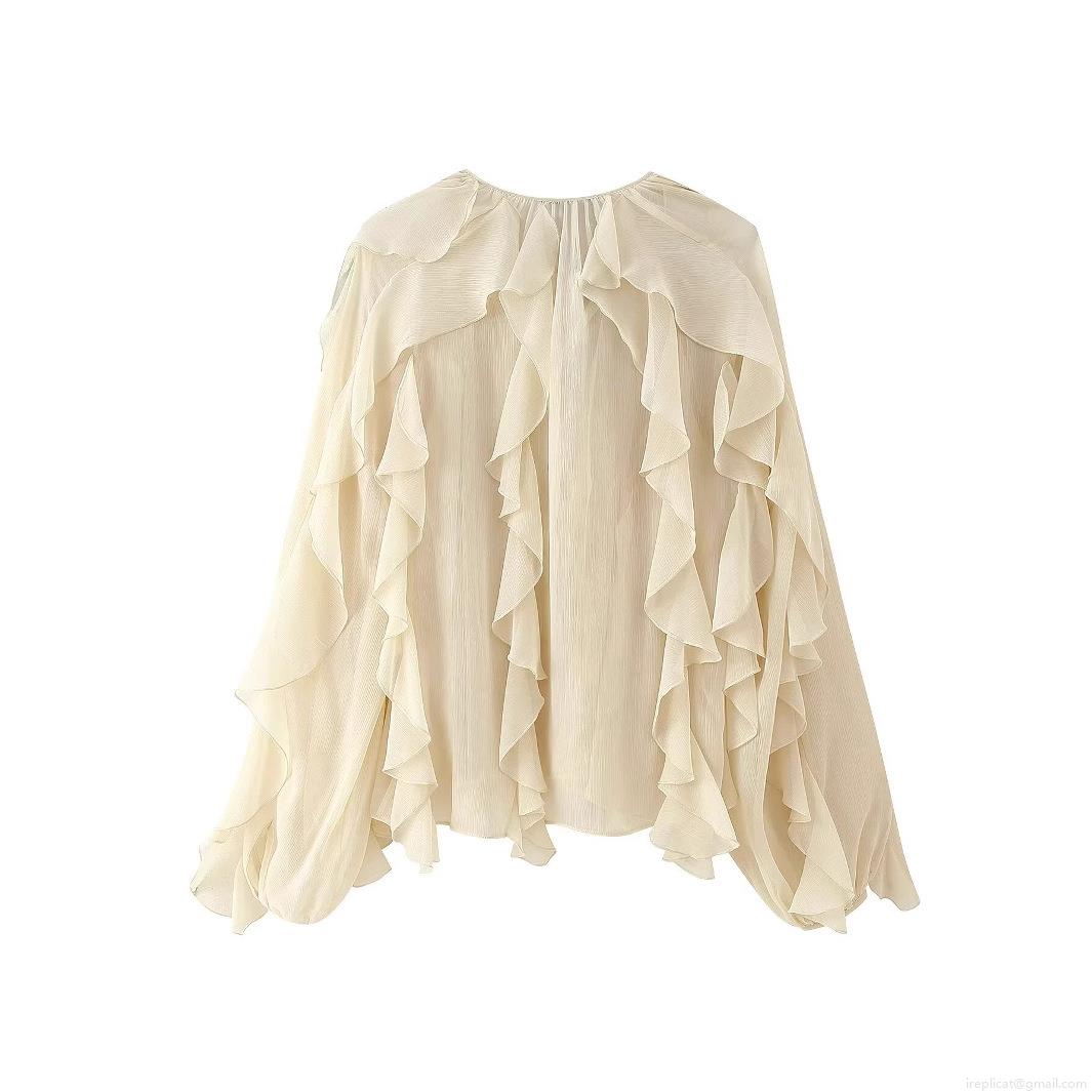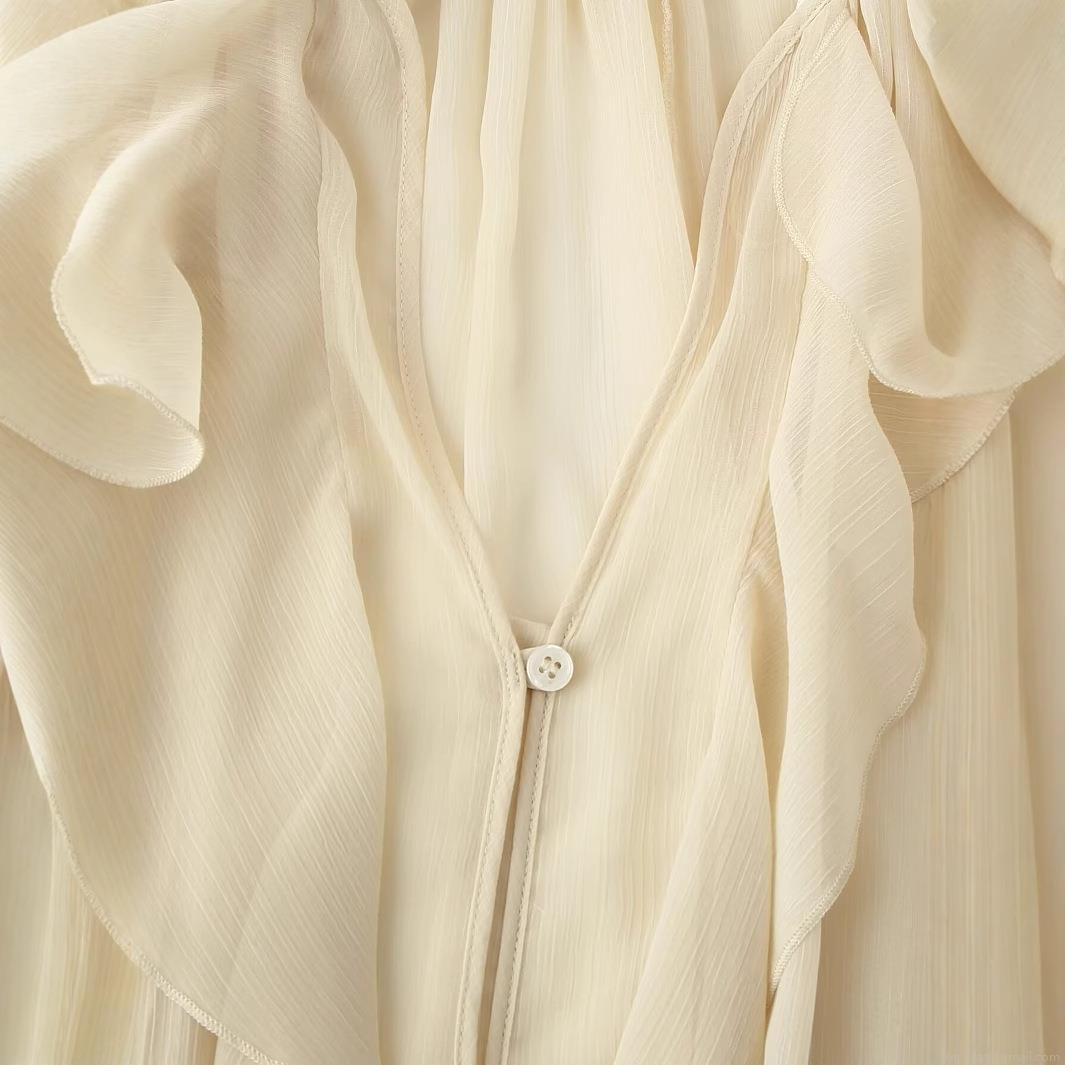• Women's French Style Ruffle Blouse Long Sleeve V-Neck Layered Chiffon Texture Shirt Elegant Solid Color Polyester Top for Daily Party