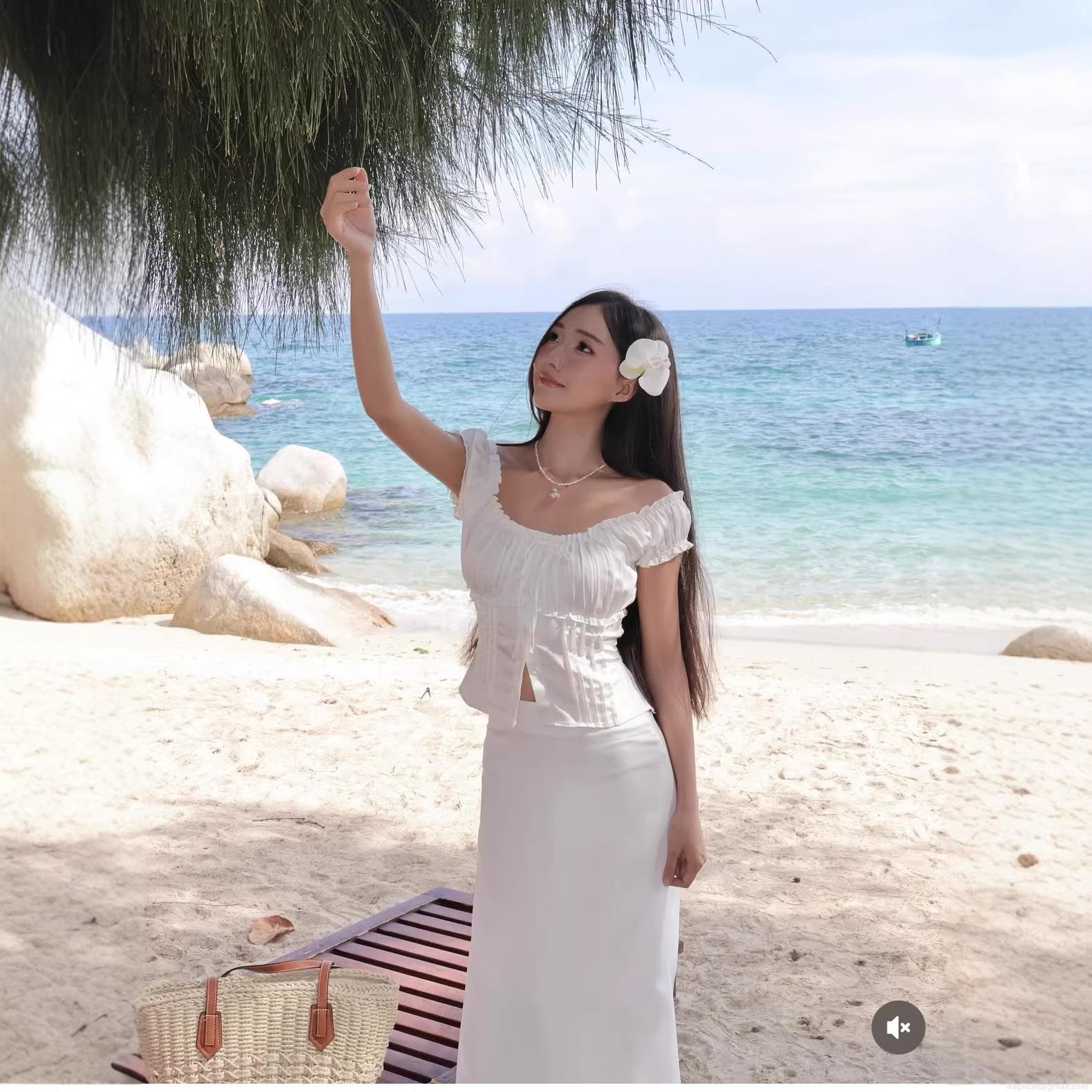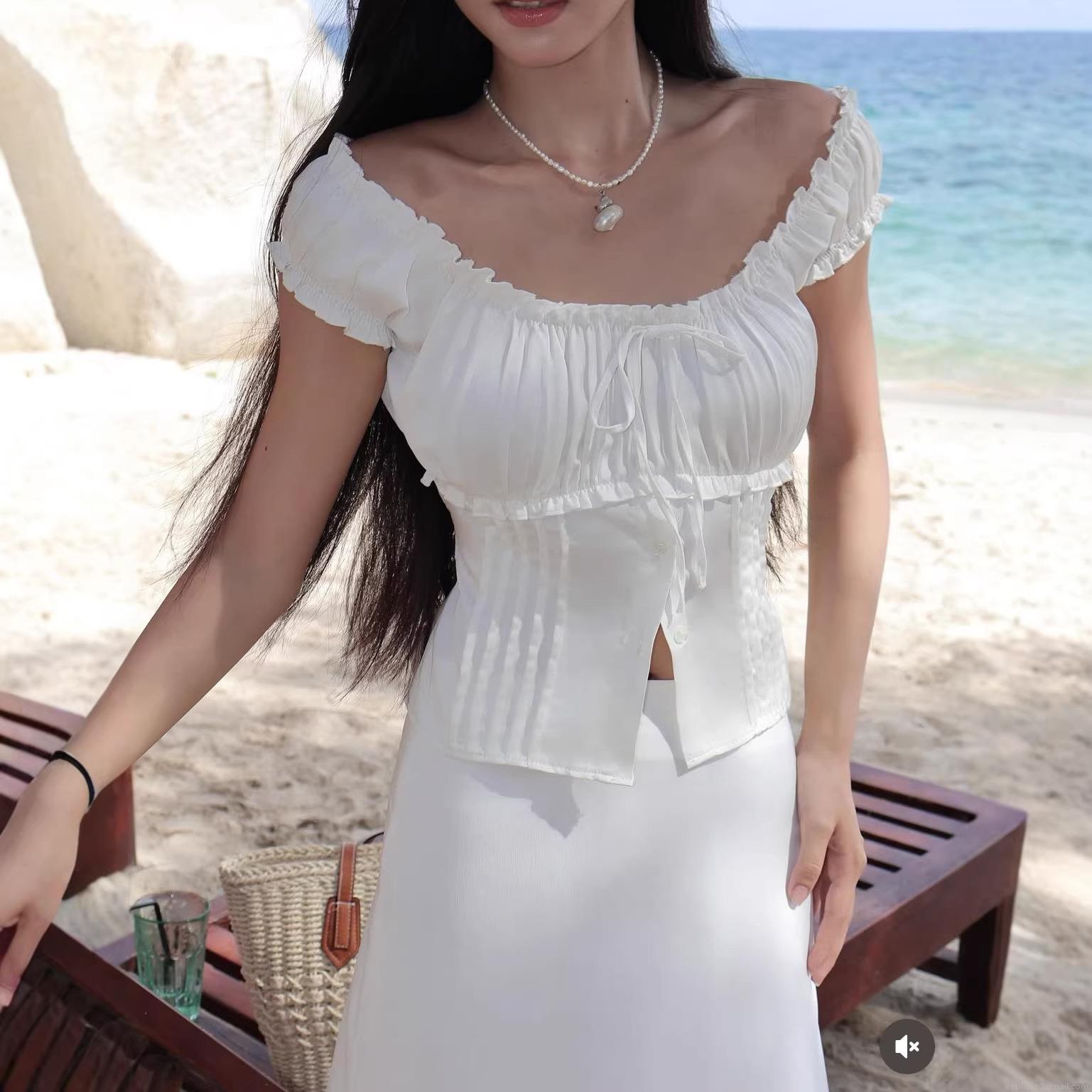 • Women's French Vintage Square Neck Puff Sleeve Crop Top Sweet Ruffle Drawstring Off Shoulder White Blouse For Summer Beach Vacation
