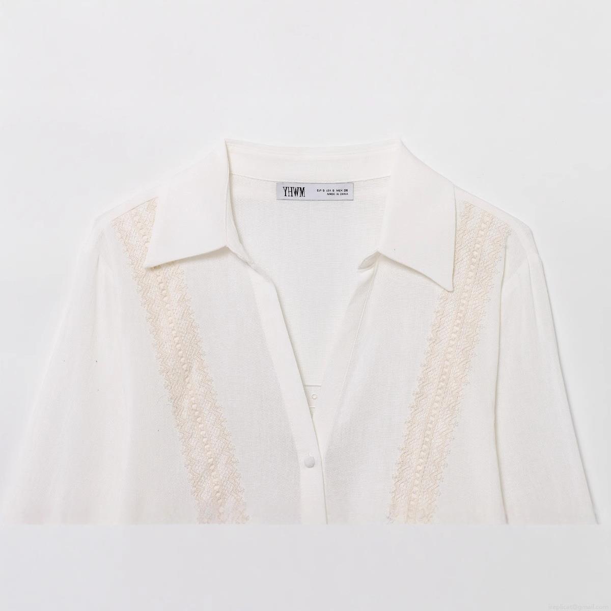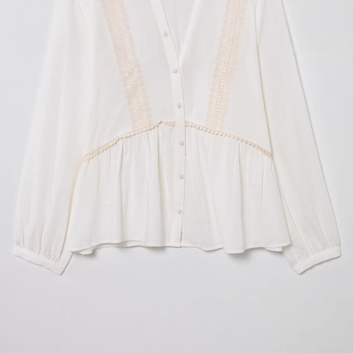 • Women's French Vintage V Neck Blouse Shirt Long Sleeve Lace Patchwork Single Breasted Ruffle Hem Faux Linen Cotton Top For Elegant Lady Daily Wear