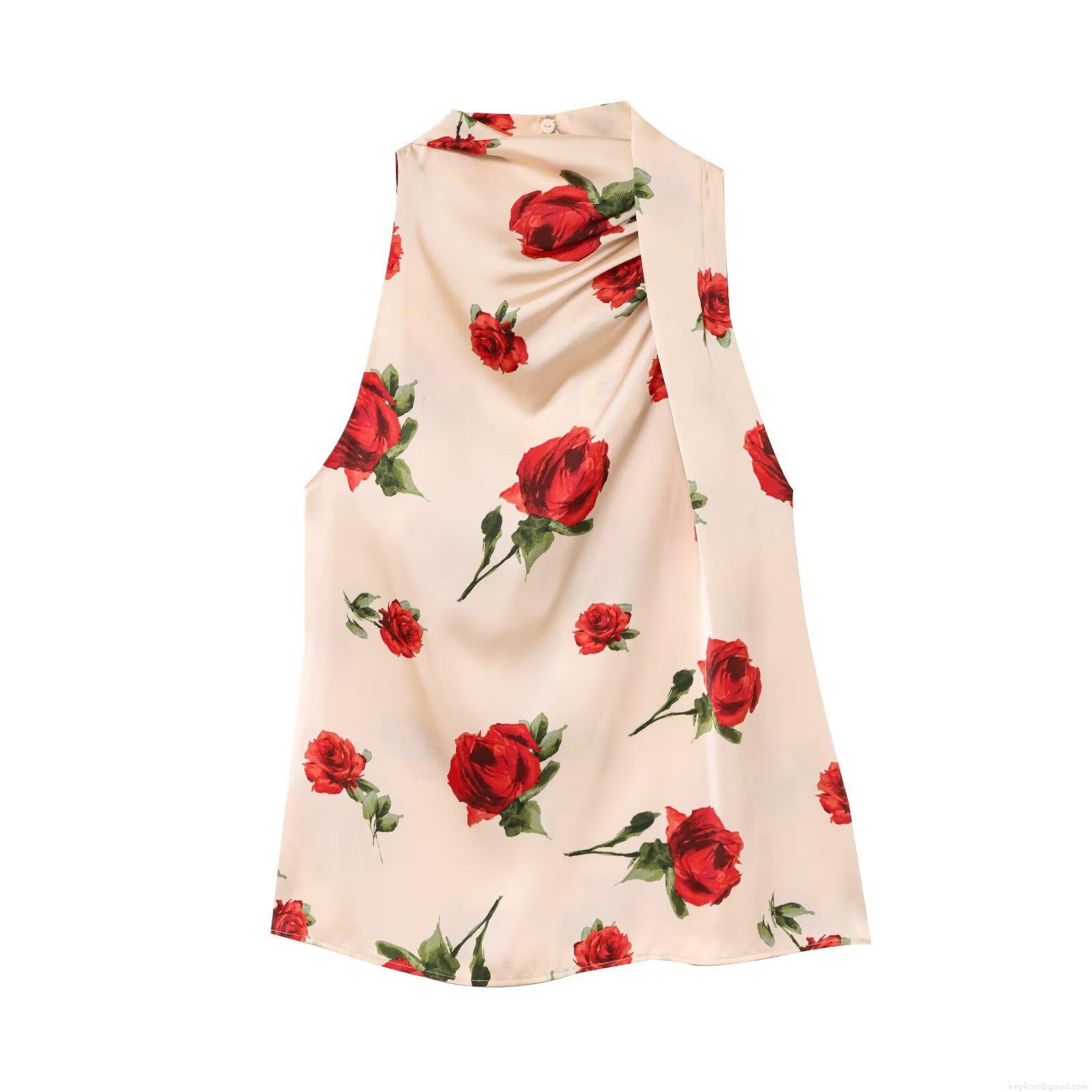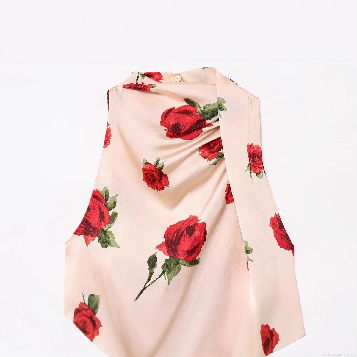 Women's Halter Neck Satin Sleeveless Blouse Elegant Red Rose Floral Print Backless Slim Fit Socialite Style Party Shirt Top for Women Lady