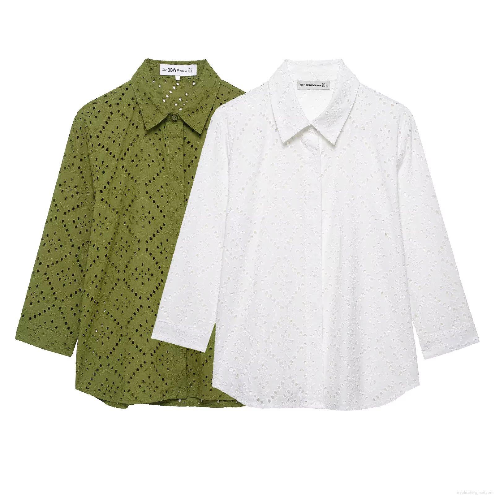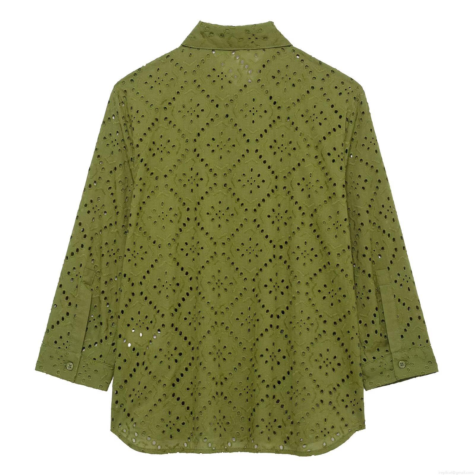 • Women's Hollow Out Embroidery Shirt Turn-down Collar Loose Blouse Casual Streetwear Solid Color Eyelet Embroidered Button Down Top