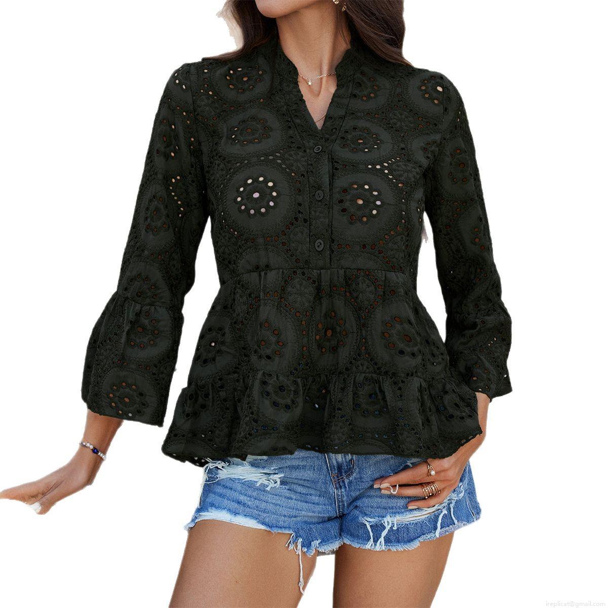 • Women's Hollow Out Embroidery V-neck Blouse 100% Polyester 3/4 Flare Sleeve Button Ruffle Hem Peplum Top Vacation Casual Shirt