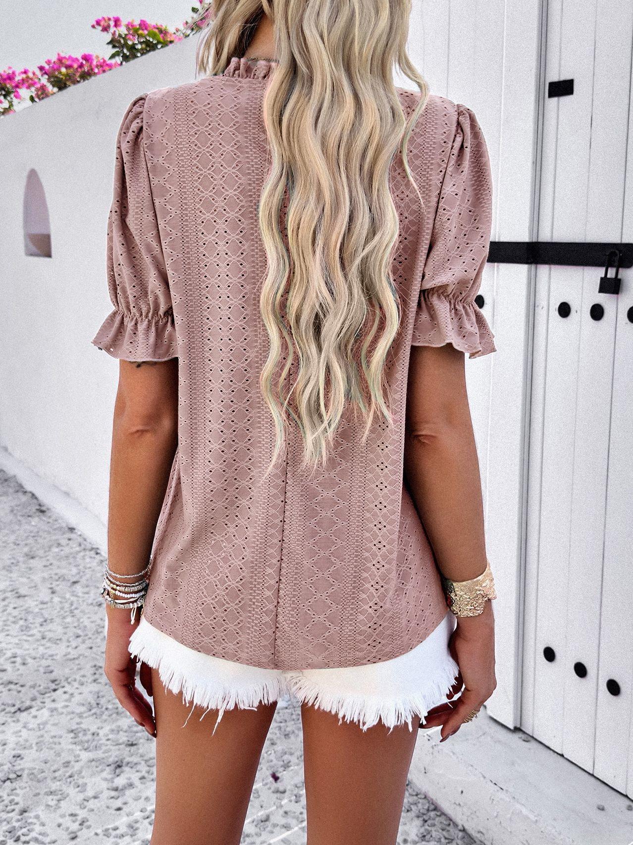 • Women's Hollow Out Eyelet Embroidery Short Sleeve Blouse Ruffle Collar Lace Mesh Top Casual Summer Vacation Shirts For Women