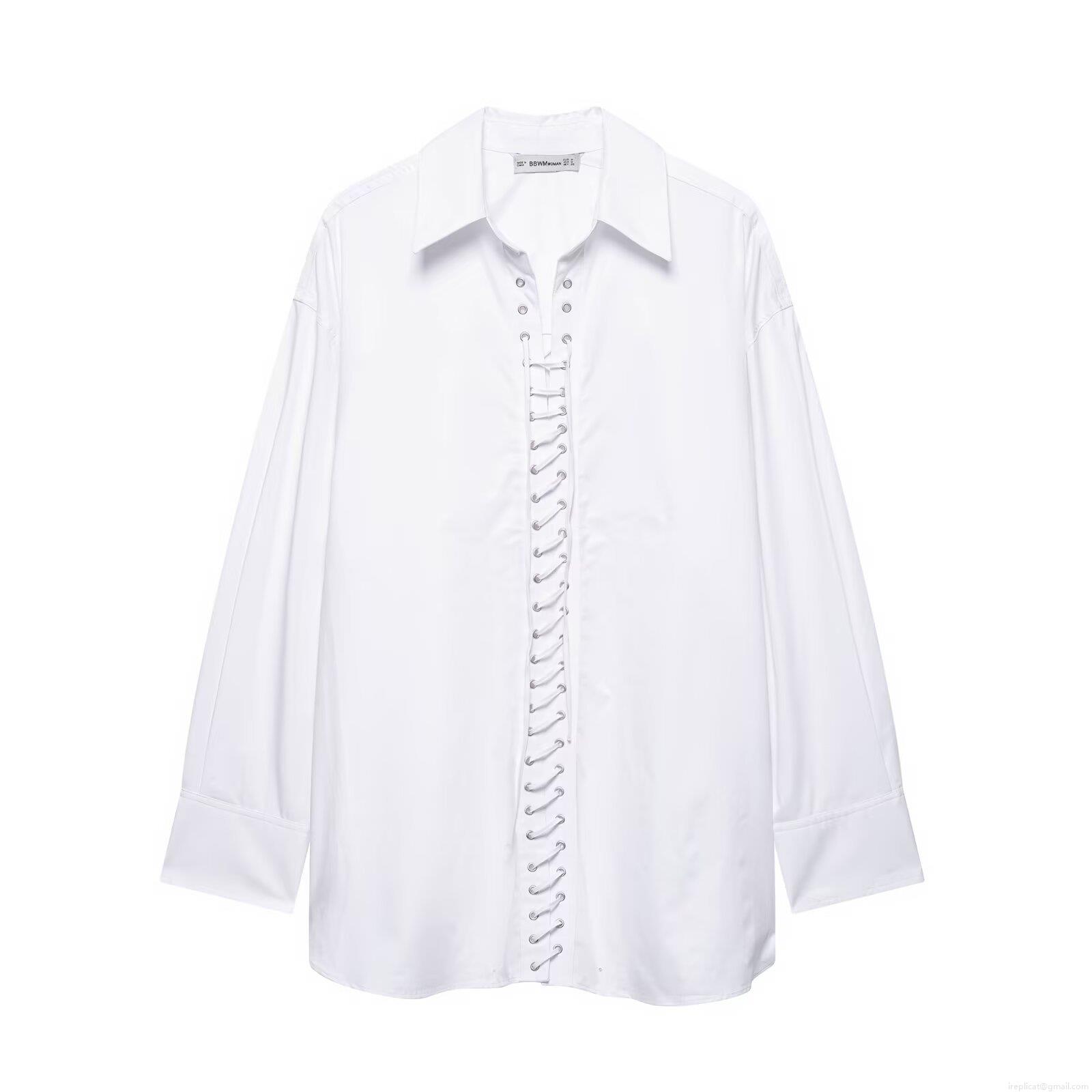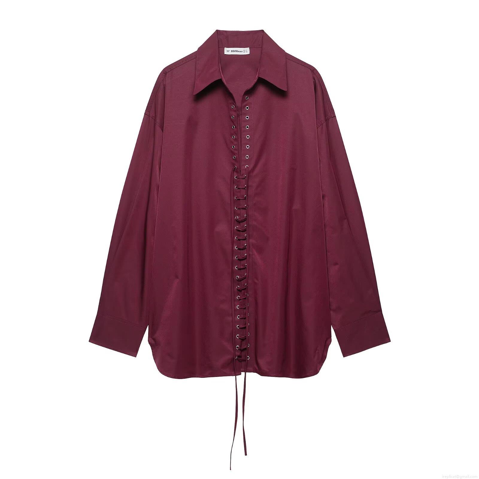 Women's Lace Up Front Long Sleeve Shirt 100% Polyester Turnover Collar Loose Blouse Casual Streetwear Top for Women