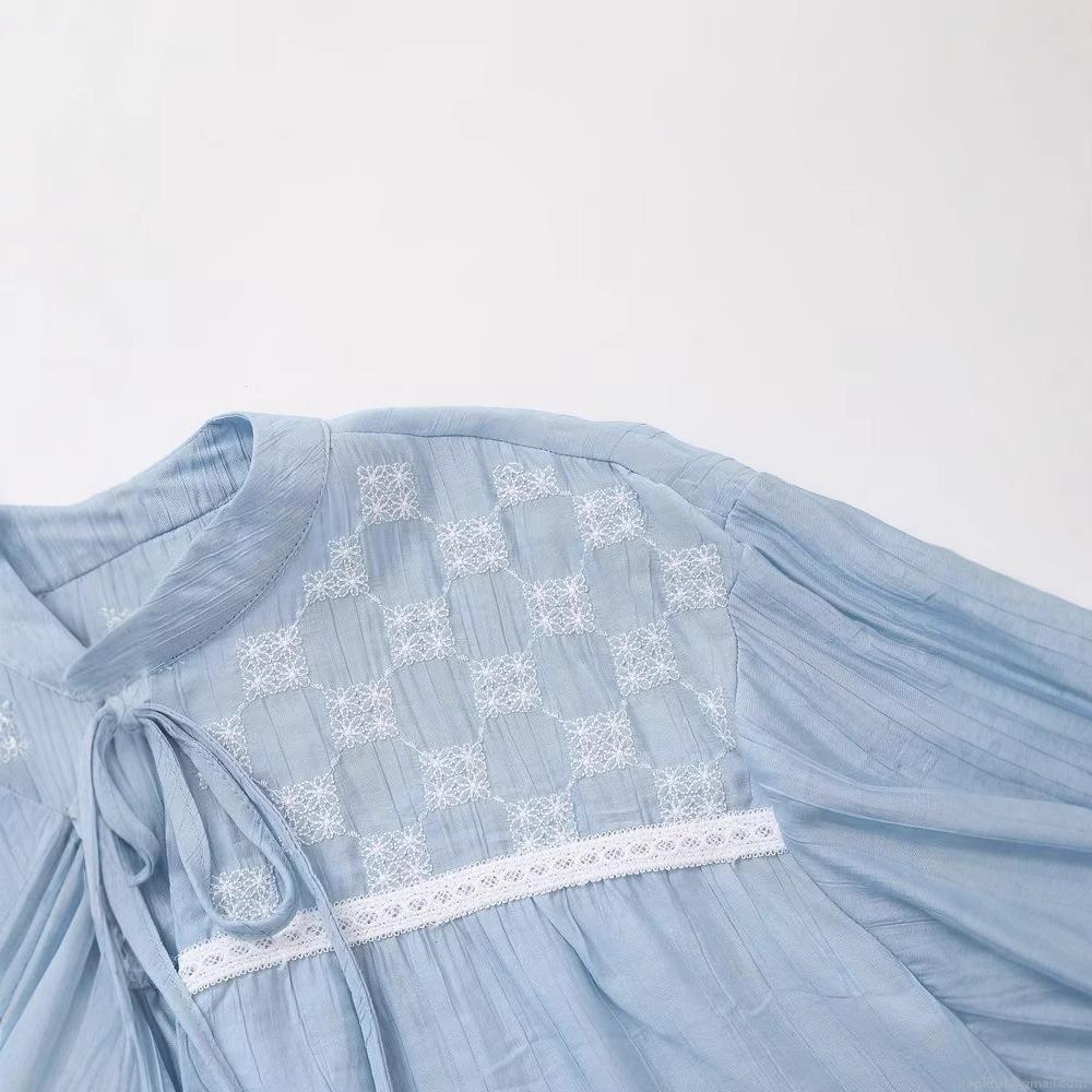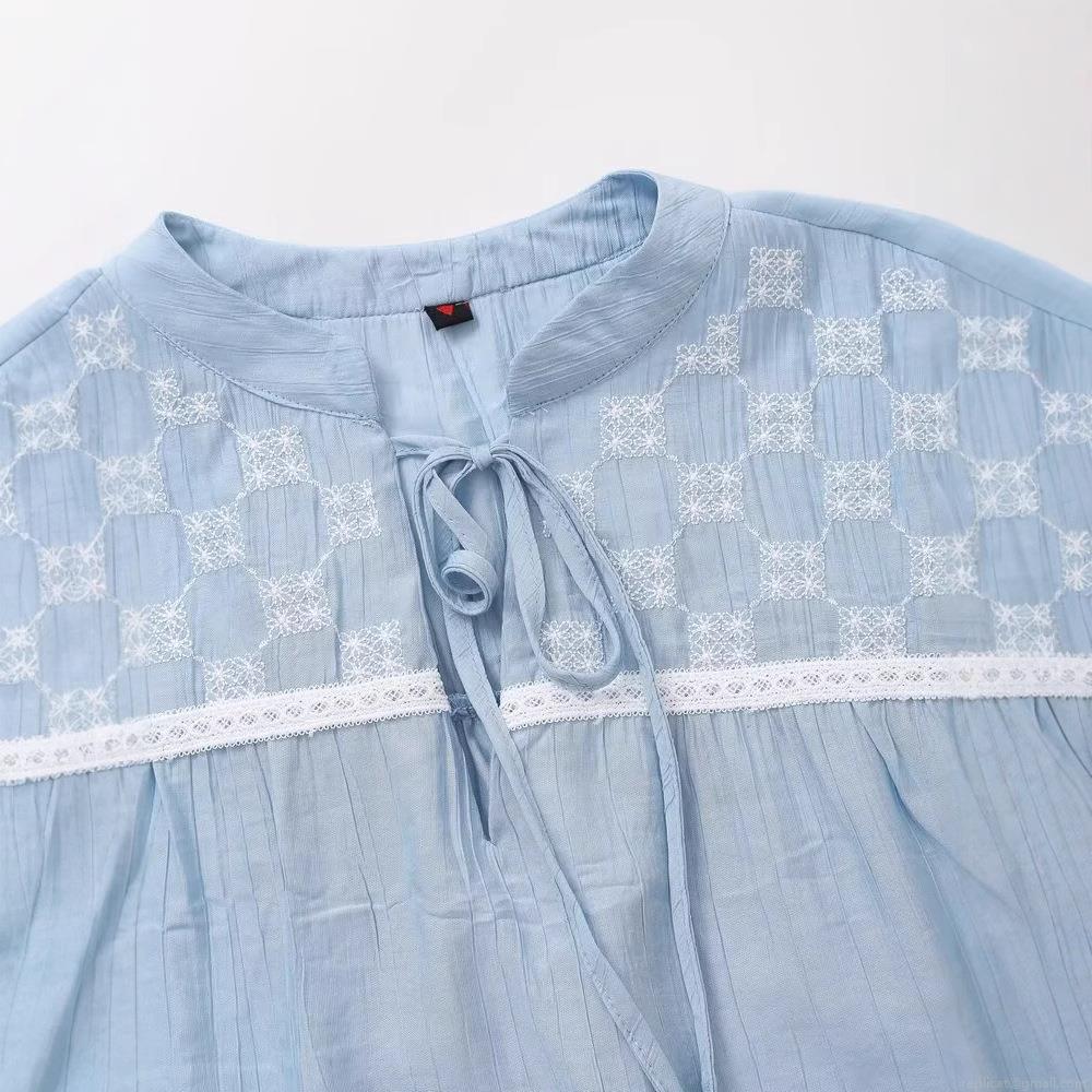 • Women's Light Blue Embroidered Blouse V-Neck Lace-Up Loose Textured Fabric Shirt Bohemian Casual Long Sleeve Top For Daily Travel