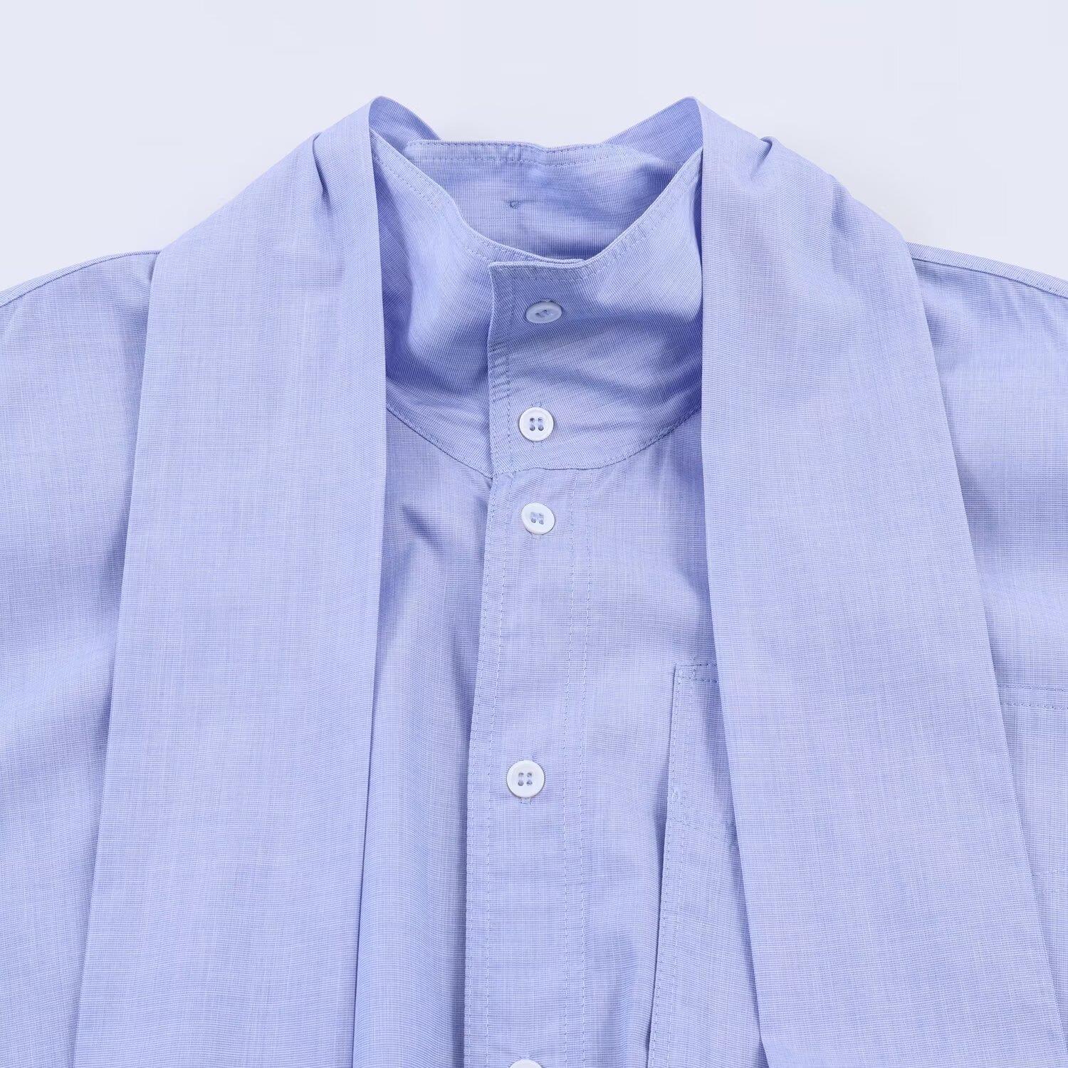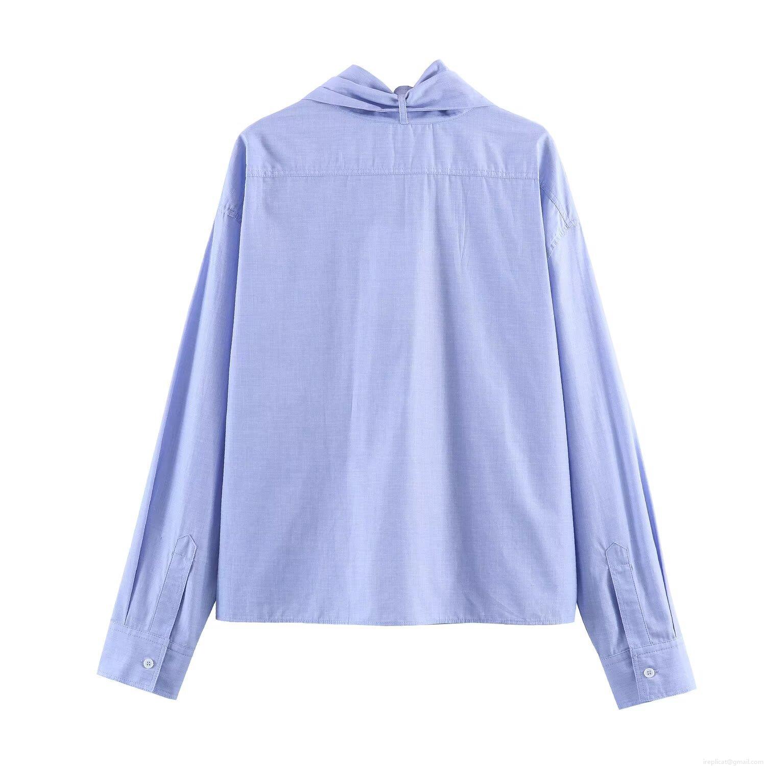 • Women's Light Blue Long Sleeve Button Up Shirt With Bow Tie Scarf Collar And Pocket Casual Sweet Elegant Polyester Poplin Blouse For Office Daily Wear