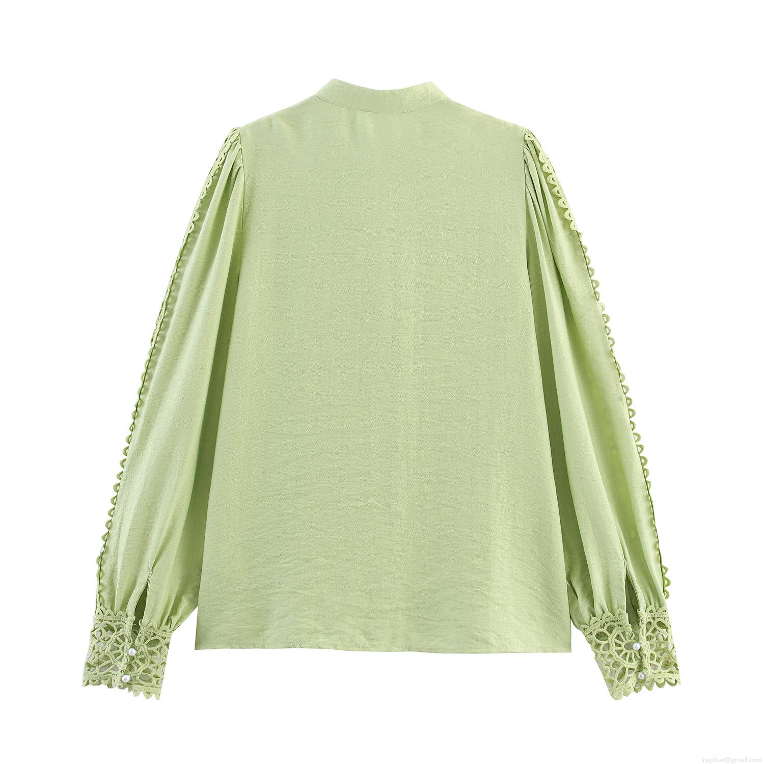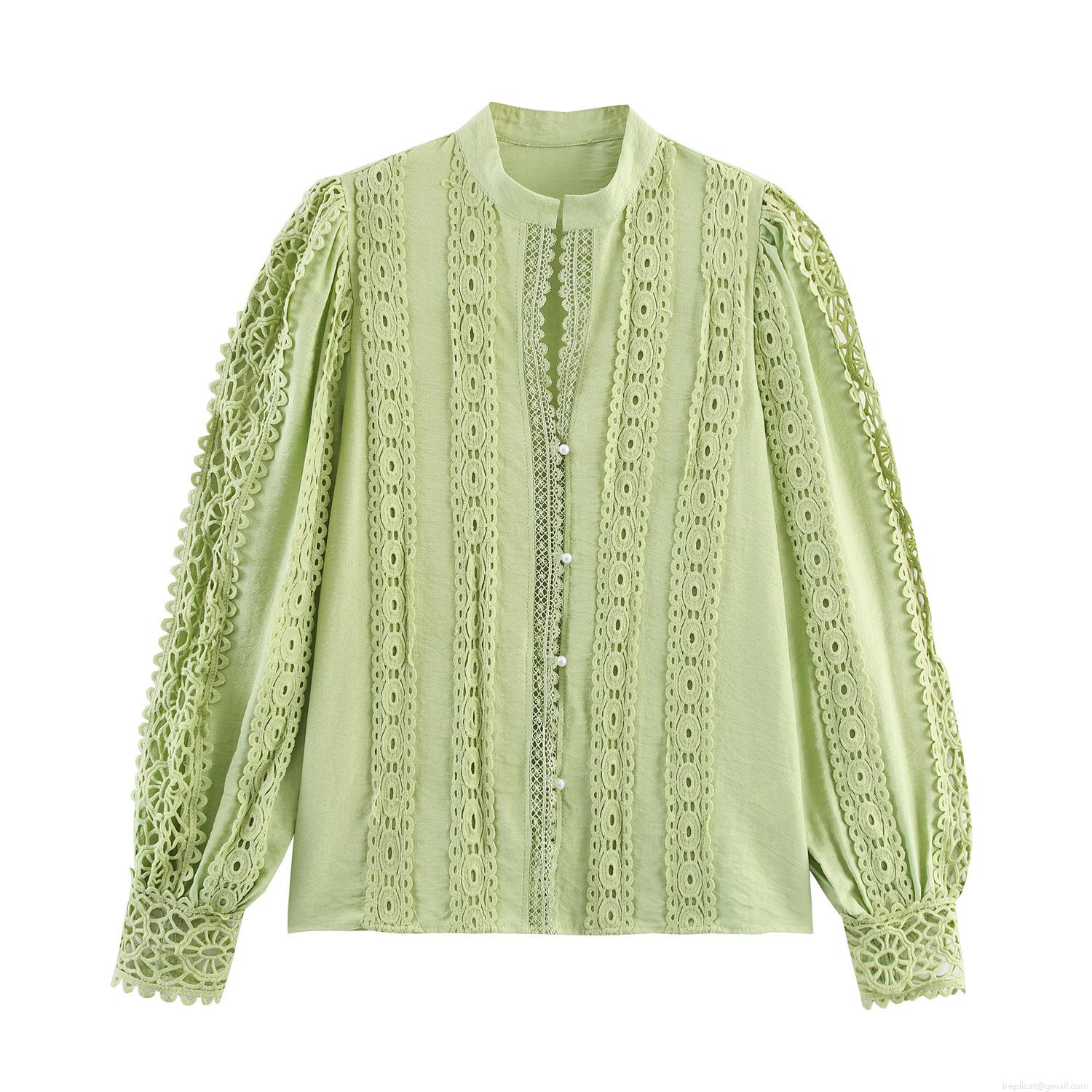 Women's Light Green Long Sleeve Blouse Retro Hollow Out Lace Patchwork Shirt With Pearl Buttons Lantern Sleeve Sweet Elegant Loose Top For Spring