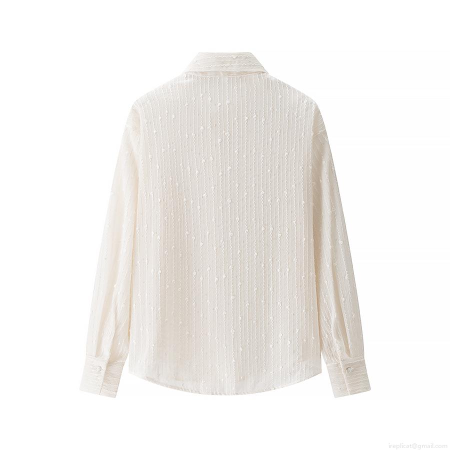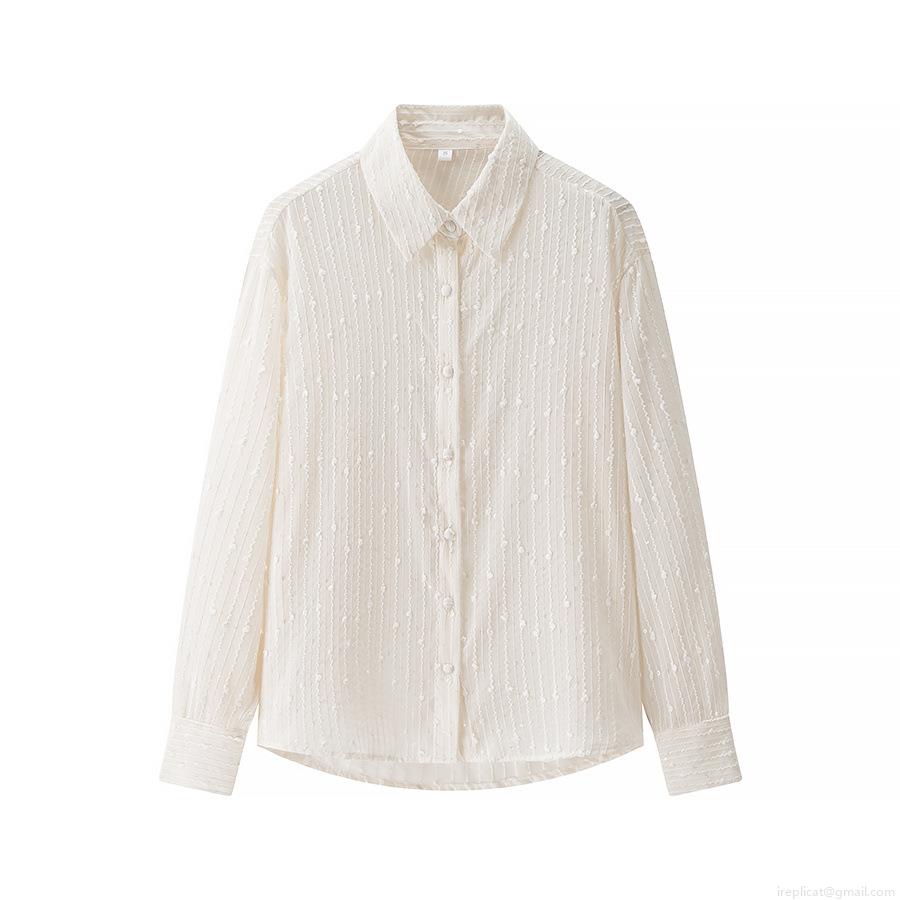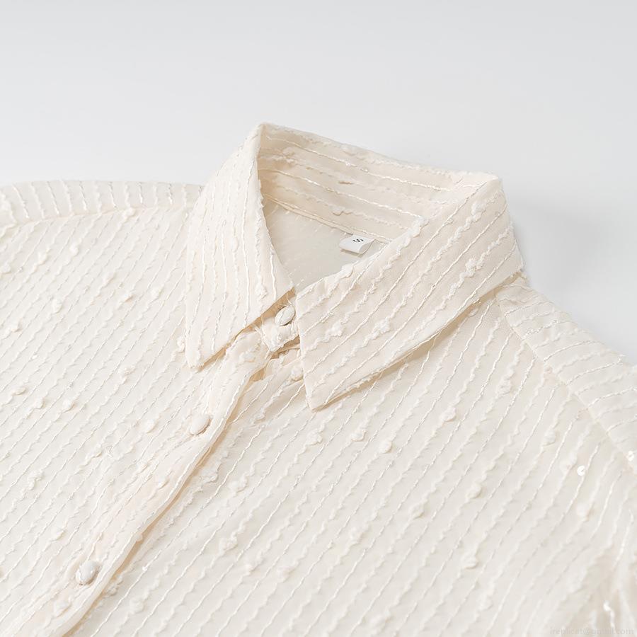 Women's Long Sleeve Blouse 100% Polyester Sequin Textured Vertical Stripe 3D Dot Shirt Elegant Turn-down Collar Loose Fit Single Breasted Top