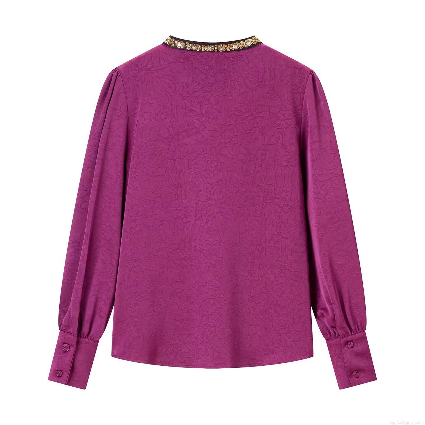 Women's Long Sleeve Blouse Satin Pleated V-Neck Beaded Top Solid Color Rose Red Street Style Elegant Casual Shirt For Women