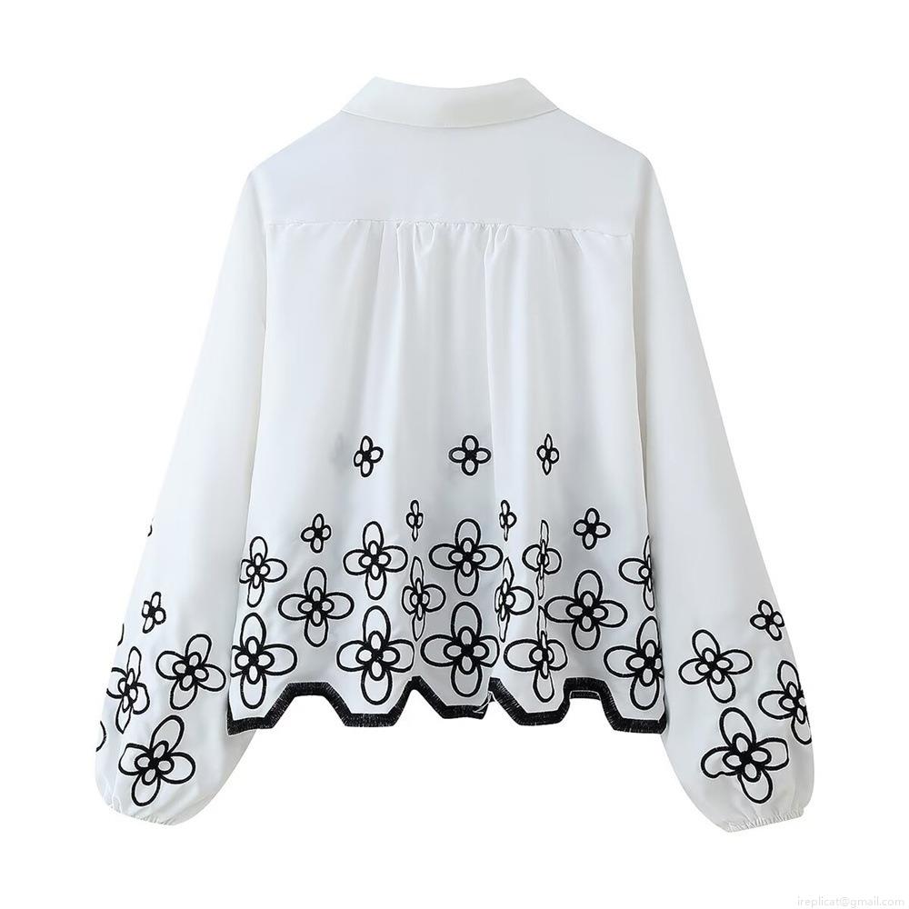 Women's Long Sleeve Blouse White 100% Polyester Black Floral Embroidery Lapel Collar Button Down Loose Fit Casual Elegant Shirt For Women Streetwear