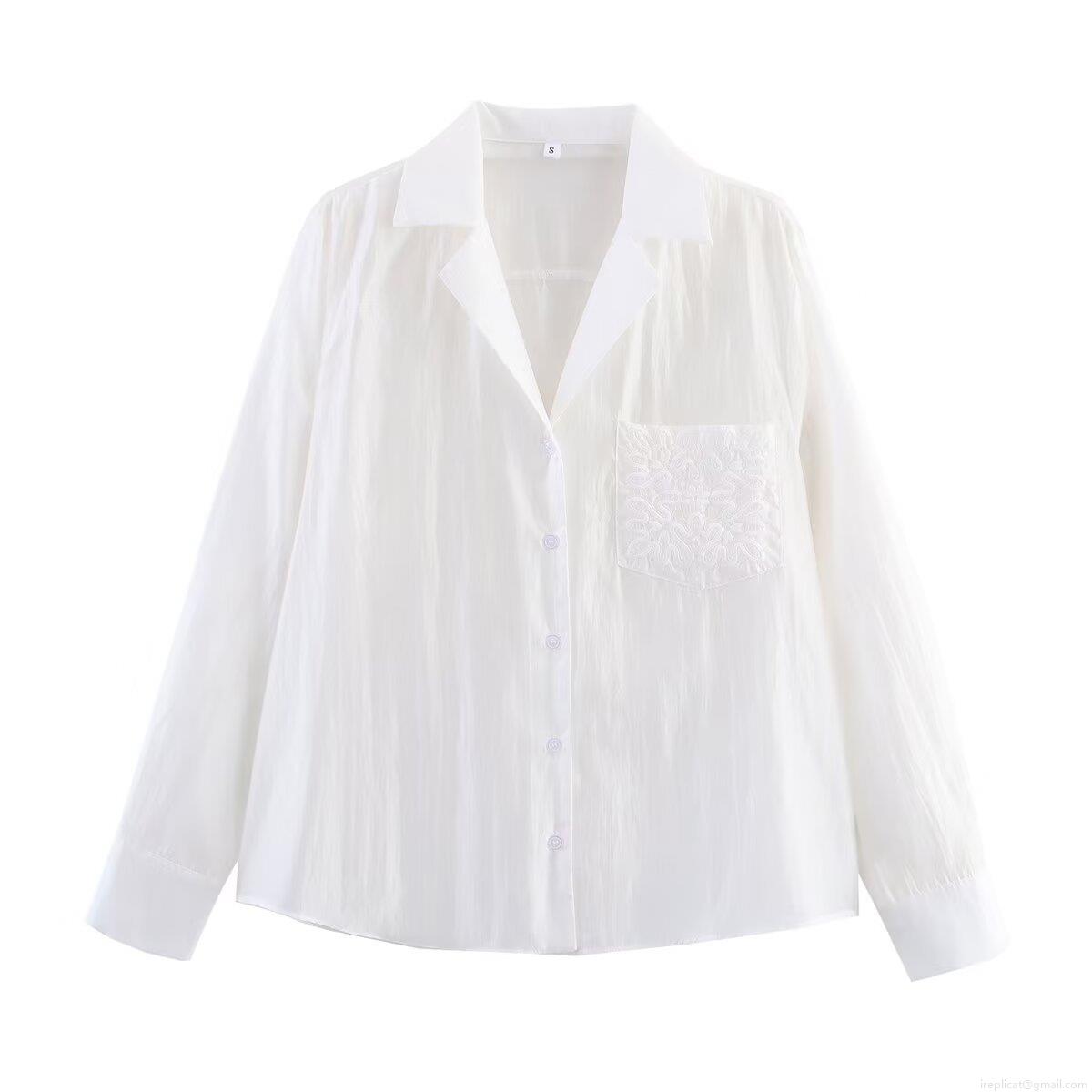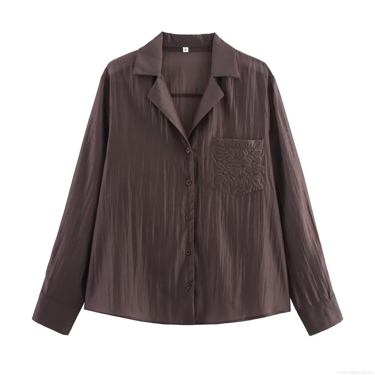 Women's Long Sleeve Button Down Shirt Casual Polyester Blouse With Embroidery Pocket Solid Color Textured Top For Daily Office Work