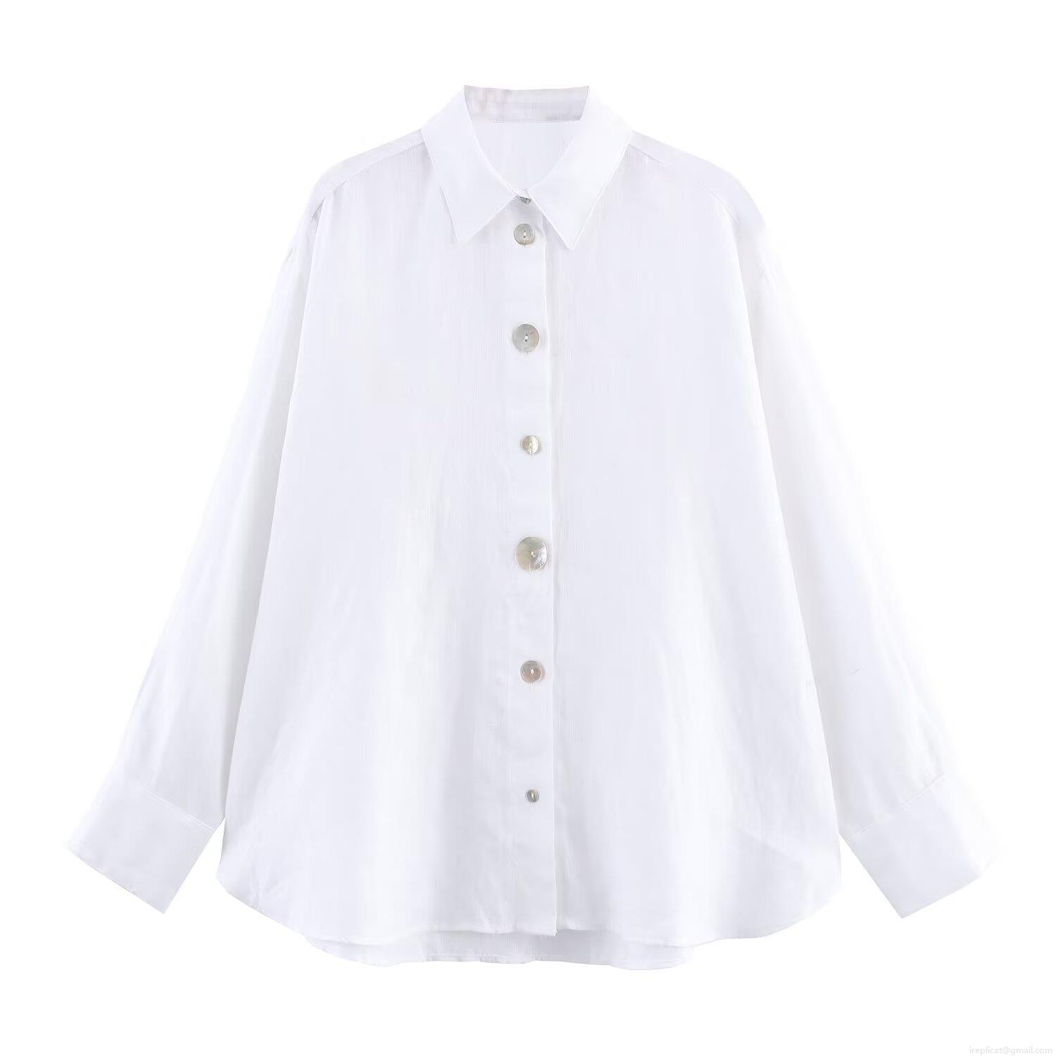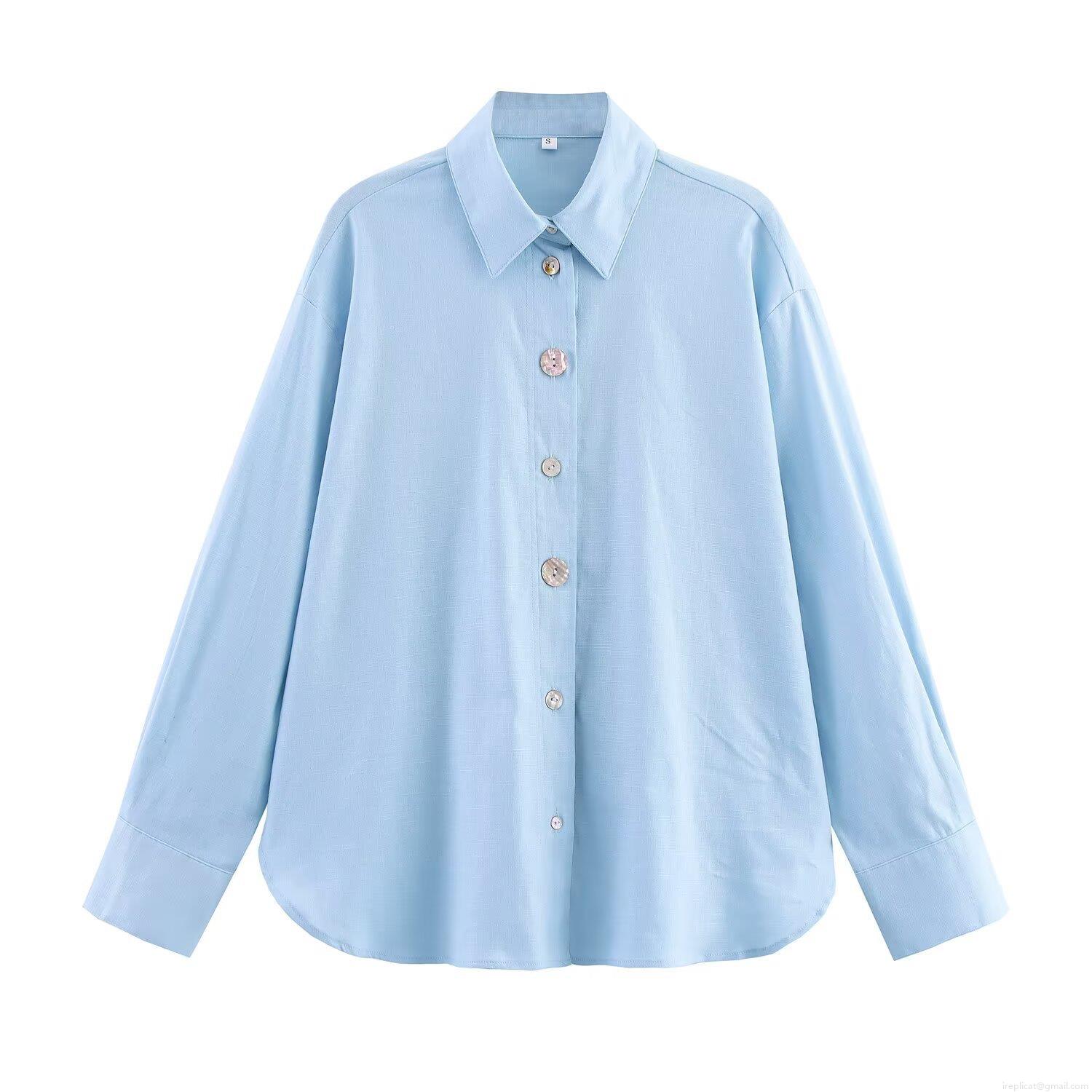 • Women's Long Sleeve Button Up Shirt Faux Linen Polyester Solid Color Blouse With Curved Hem Casual Elegant Top For Daily Office Work Lady