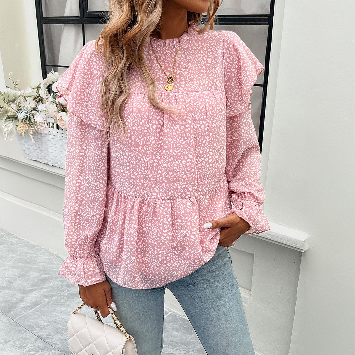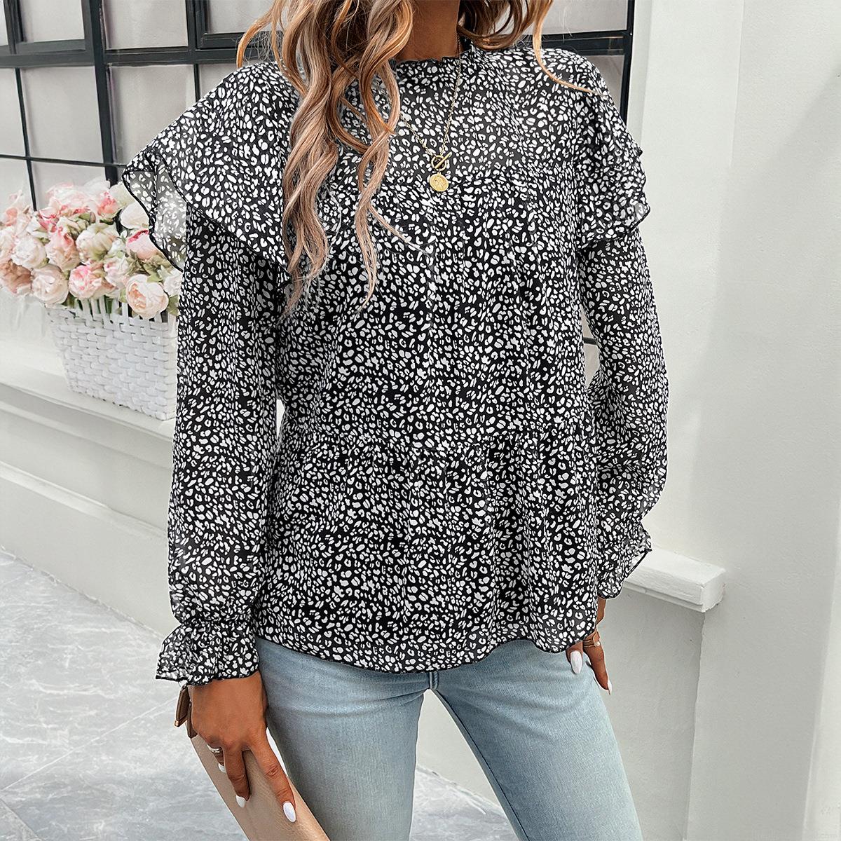 Leopard Print, Wood Ear Edge, Floral Pattern, Ruffles, Plants And Flowers, Stand-up Collar, Lantern Sleeves, Layered Hem