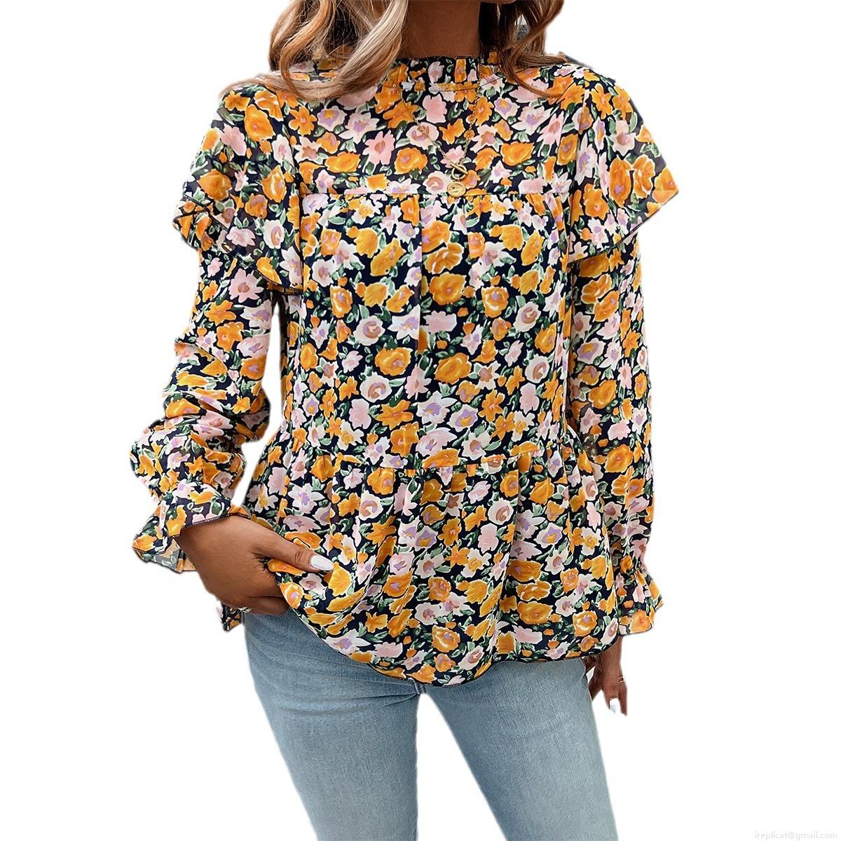 Women's Long Sleeve Chiffon Blouse Floral Leopard Print Ruffle Stand Collar Peplum Top Elegant Casual Office Shirt For Women