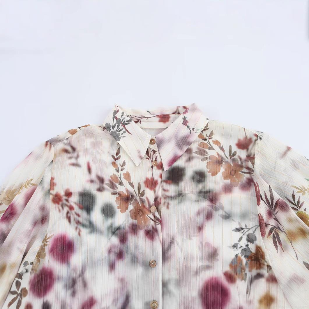 • Women's Long Sleeve Floral Print Chiffon Blouse With Metallic Gold Wire Pleated Design Ruffle Cuff Button Down Shirt For Streetwear Office Spring