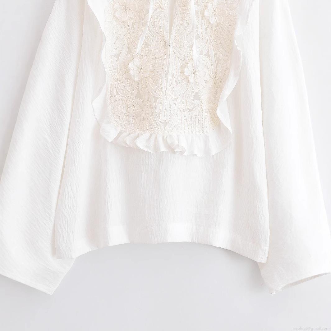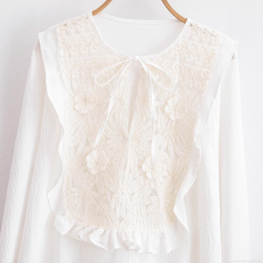 • Women's Long Sleeve Lace Patchwork Blouse Elegant Embroidery Ruffle Tie Neck Shirt Solid White Casual Sweet Tops for Ladies