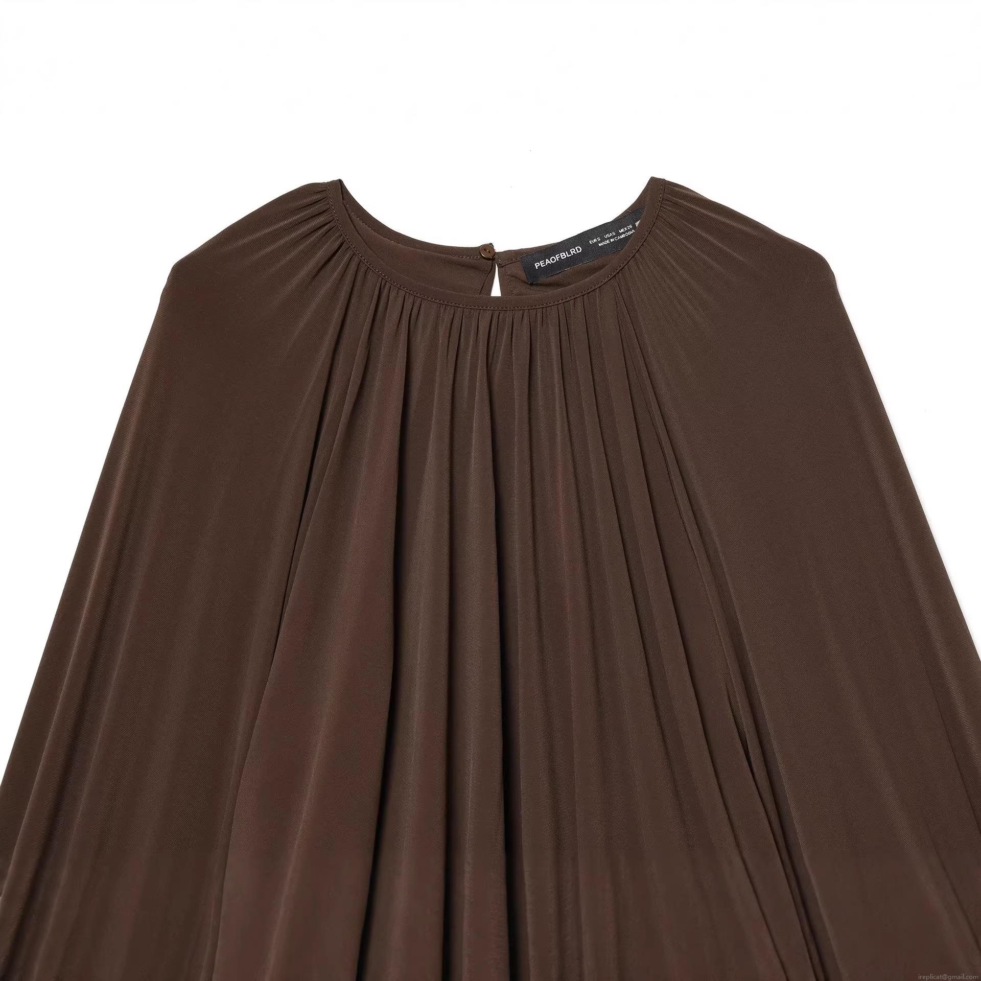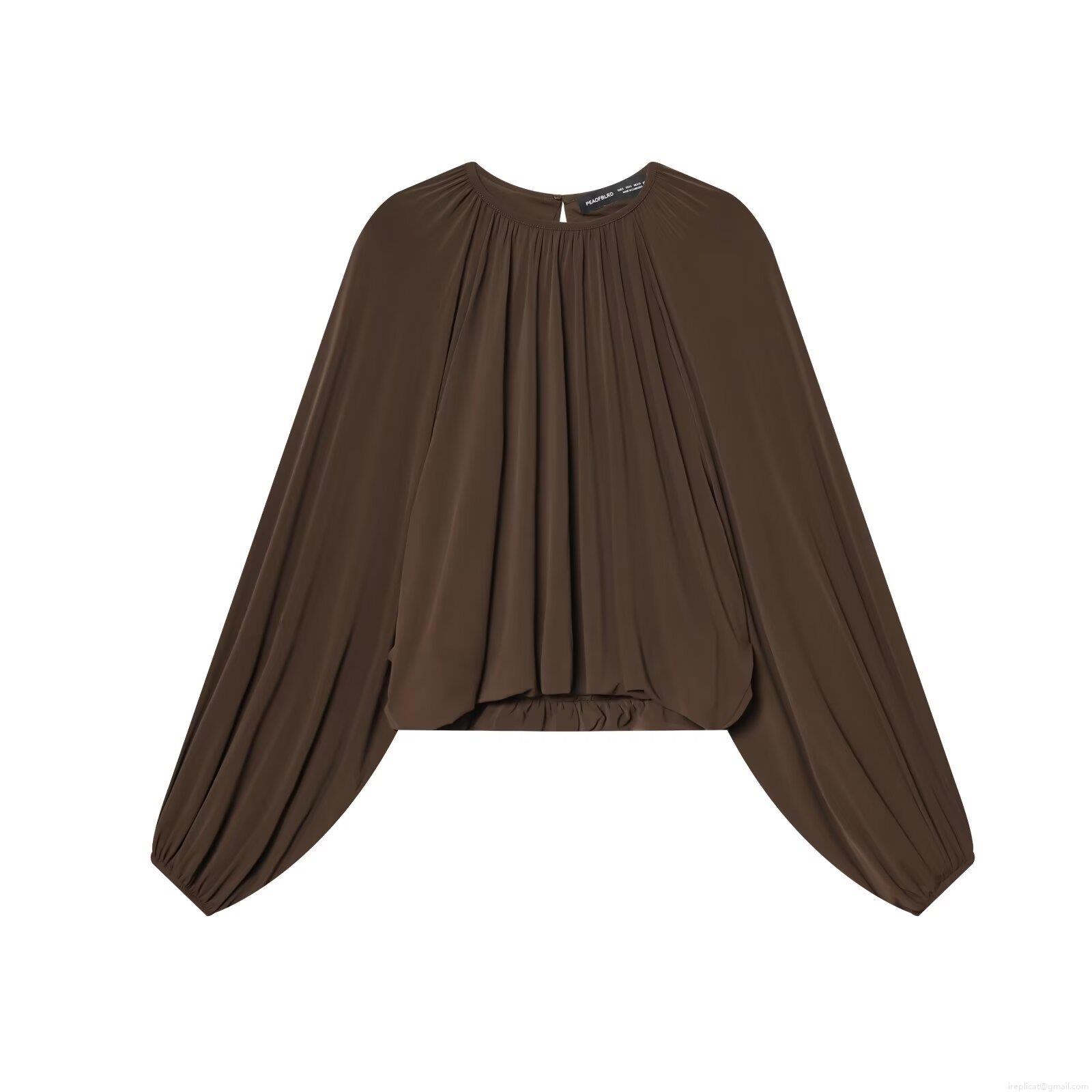 • Women's Long Sleeve Pleated Blouse Polyester Smooth Round Neck Lantern Sleeve Loose Top Casual Commuting Plain Color Fashionable Shirt for Ladies