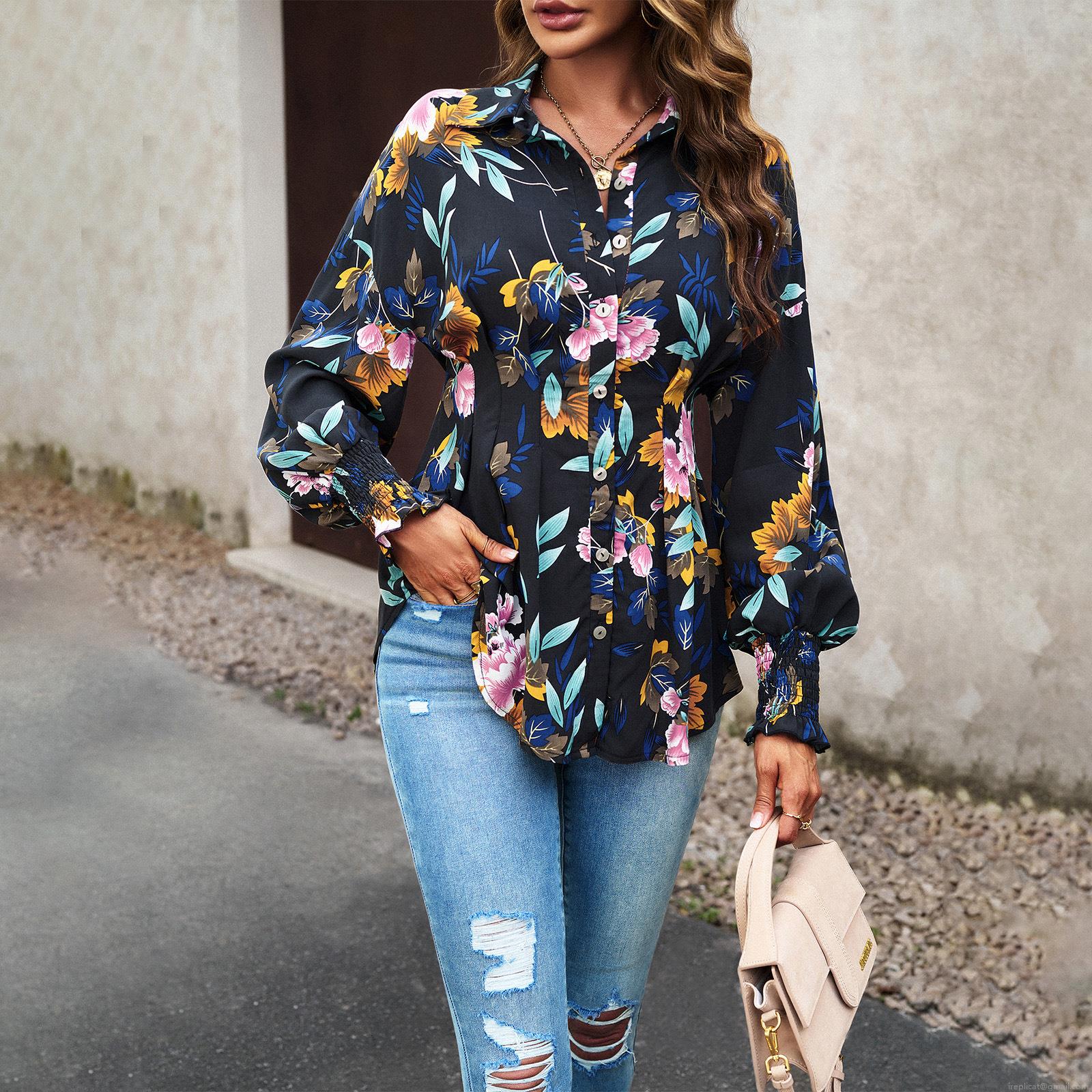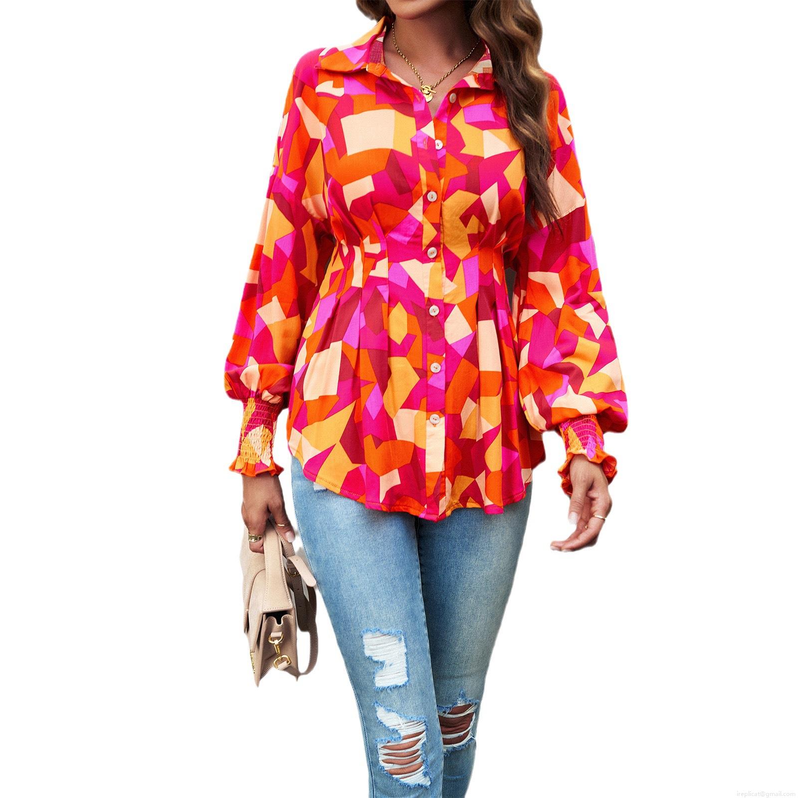 • Women's Long Sleeve Rayon Printed Blouse Fashion Commuter Slim Fit Pullover Shirt With Lantern Sleeves Leopard Floral Geometric Print Top
