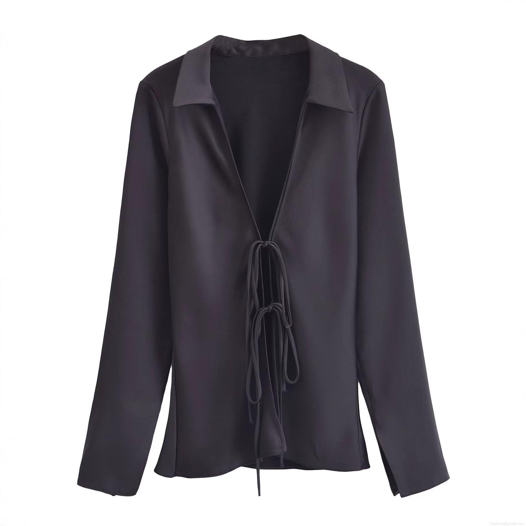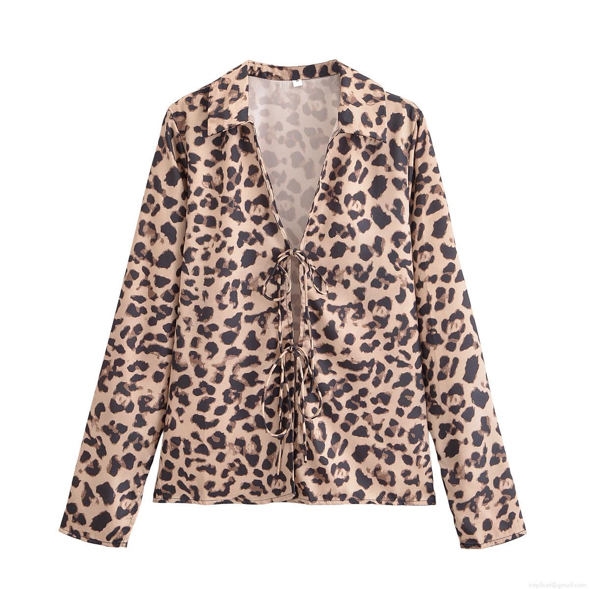 Women's Long Sleeve Satin Blouse Lapel Tie Front Shirt Elegant Solid Leopard Print Blouses Sexy Streetwear Casual Autumn Tops