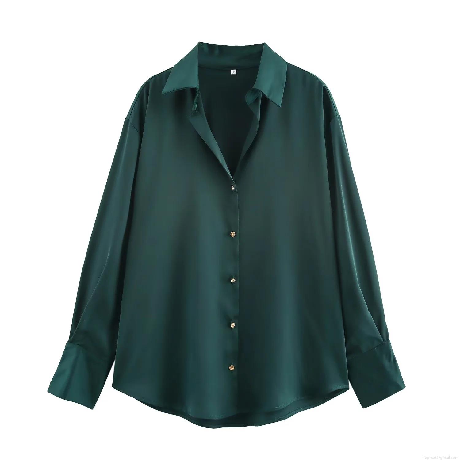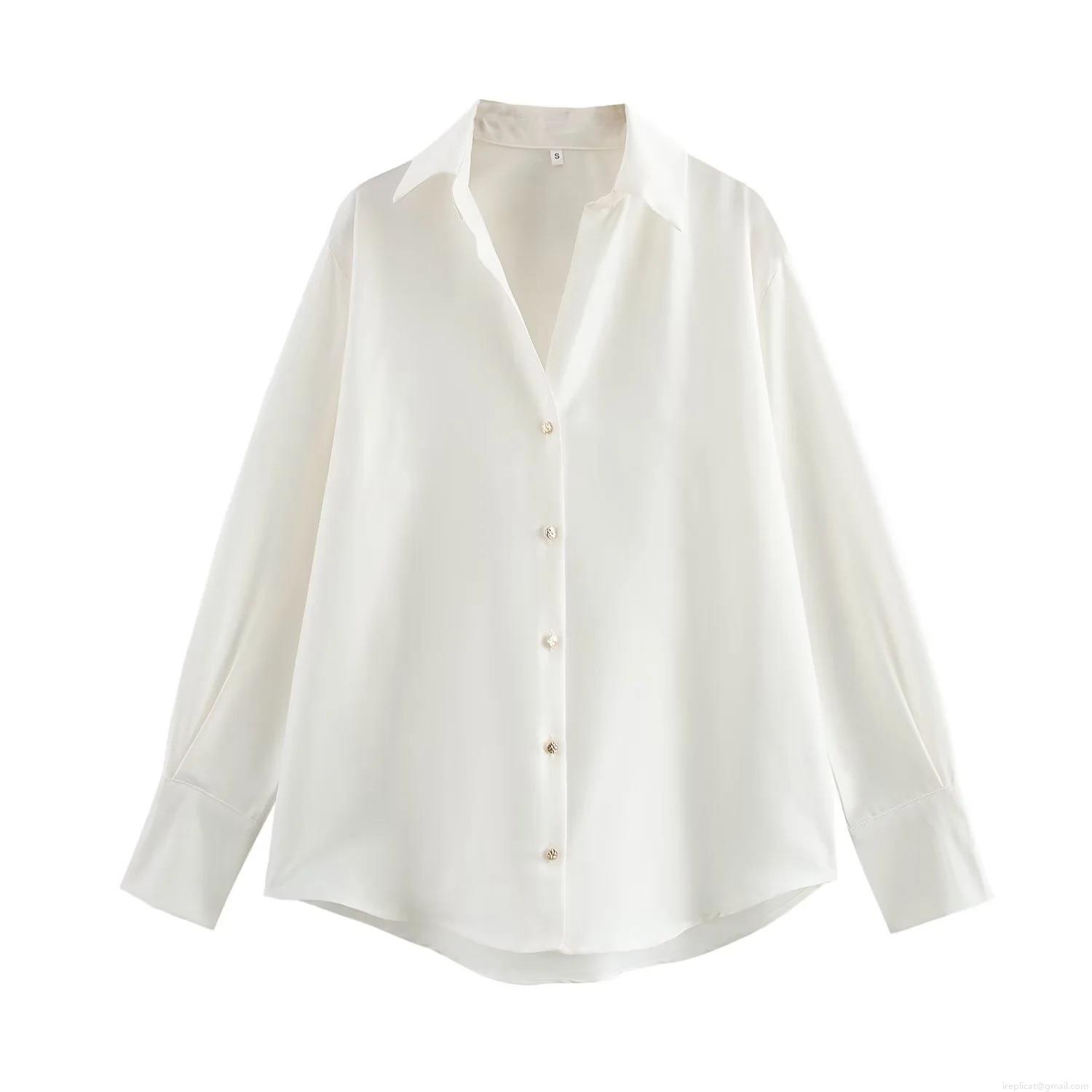 Solid Color, Satin Texture, Shirt Collar, Metallic Buttons