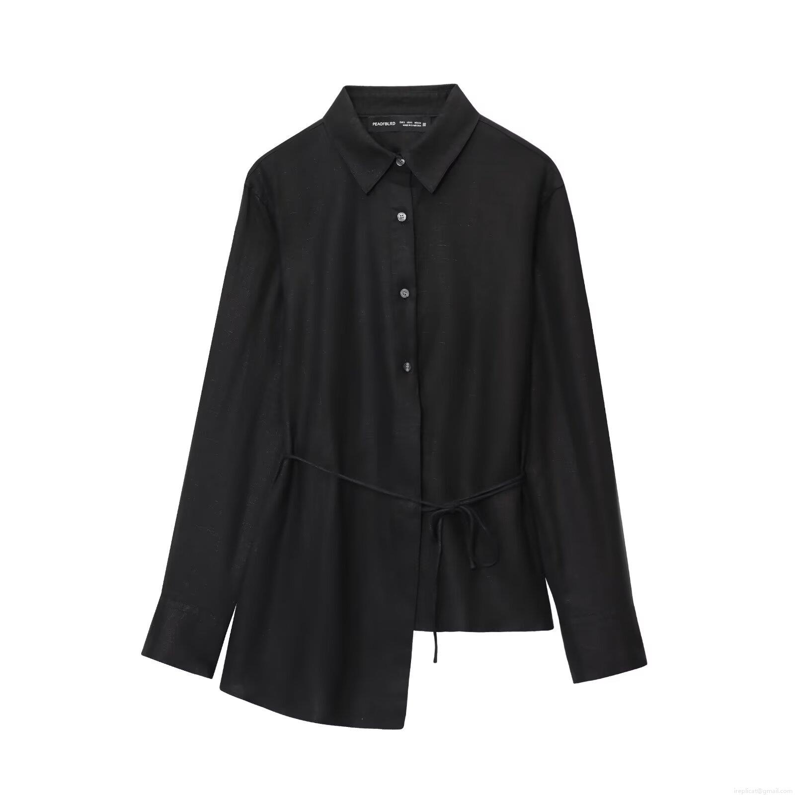 Women's Long Sleeve Shirt Asymmetric Hem Waist Tie Lapel Single Breasted Cotton Blend Blouse Casual Streetwear Trendy Top for Women