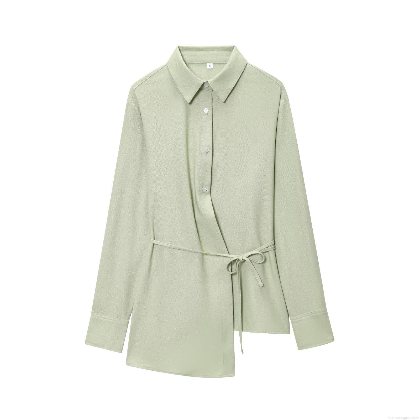 • Women's Long Sleeve Shirt Cotton Linen Blend Asymmetric Hem Blouse Casual Solid Color Button Down Top with Waist Tie Elegant Ladies Office Dating Fashion Clothing