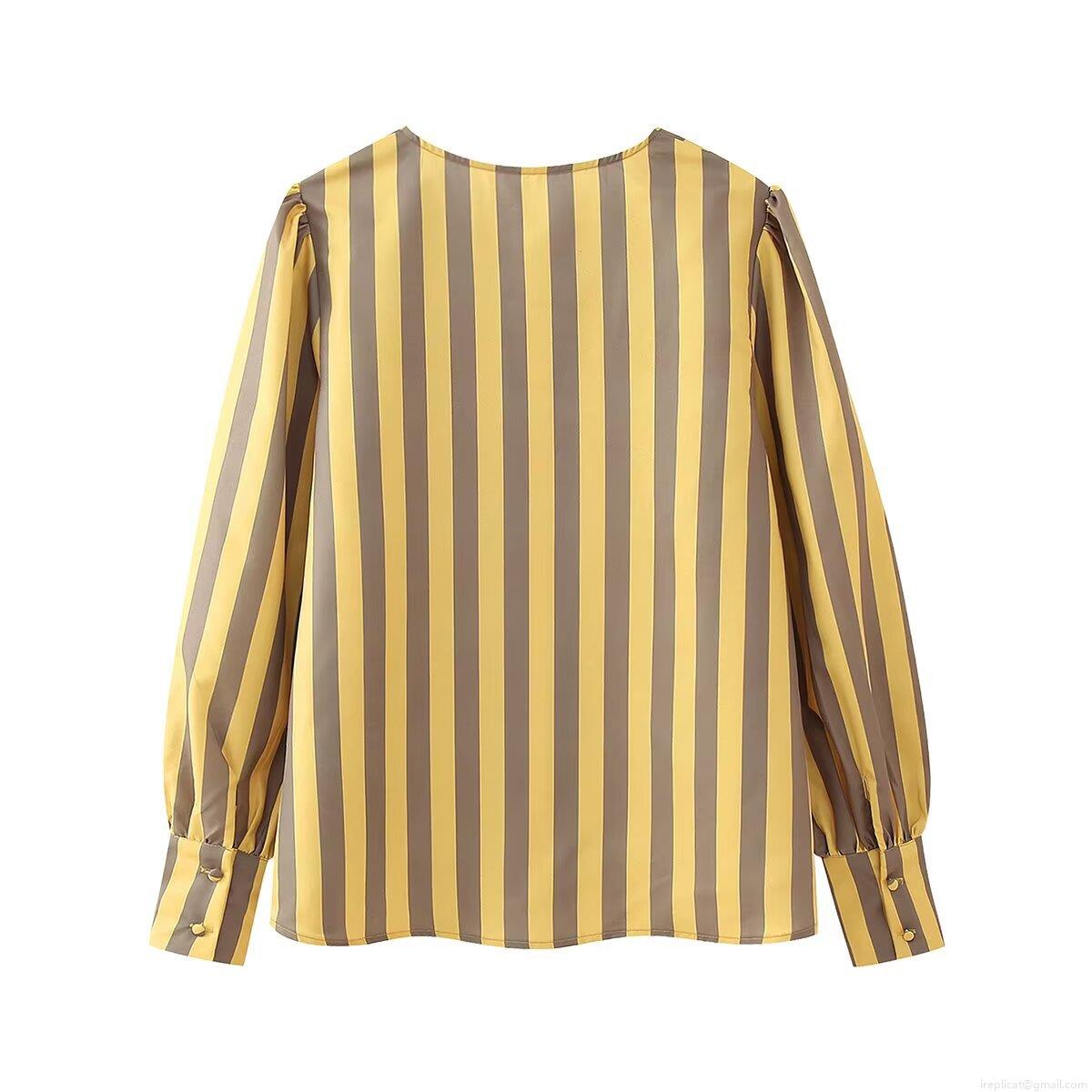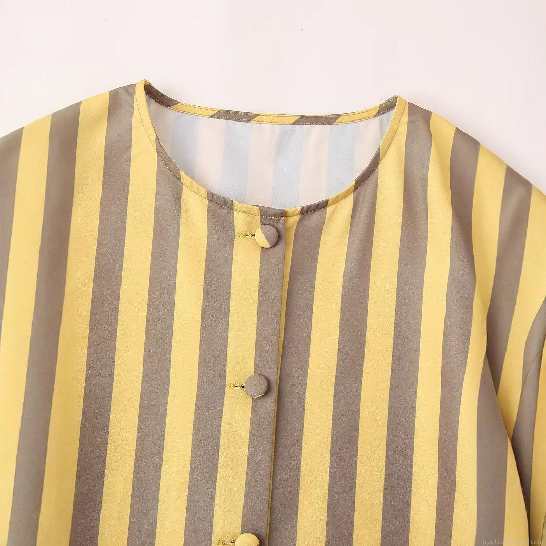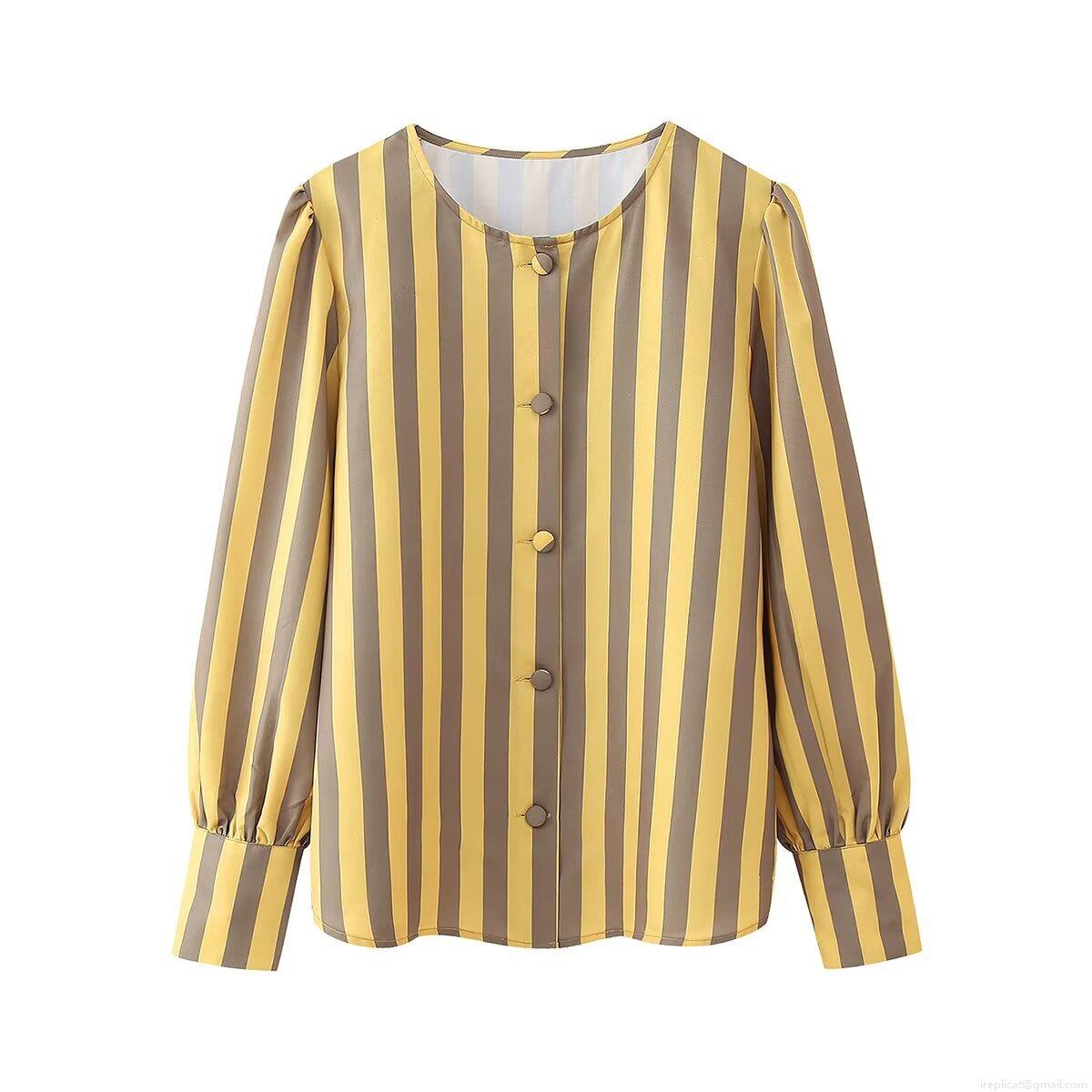 • Women's Long Sleeve Striped Blouse 100% Polyester Round Neck Vertical Stripe Shirt Elegant Puff Sleeve Single Breasted Top For Daily Casual Wear Ladies Fashion Woven Blouse