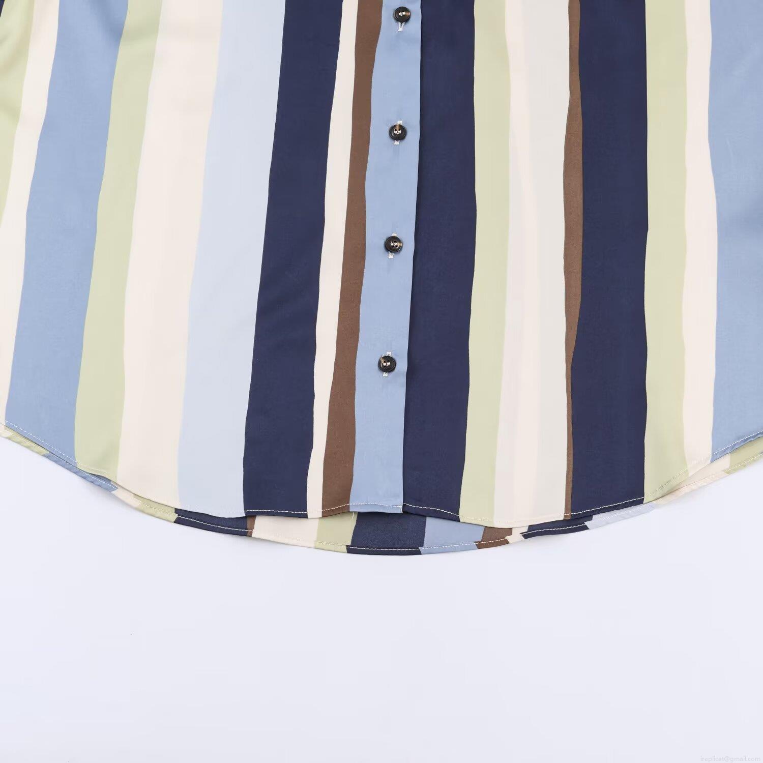 Women's Long Sleeve Striped Blouse Polyester Cotton Blend Button Down Loose Fit Polo Collar Patchwork Satin Texture Casual Shirt Top