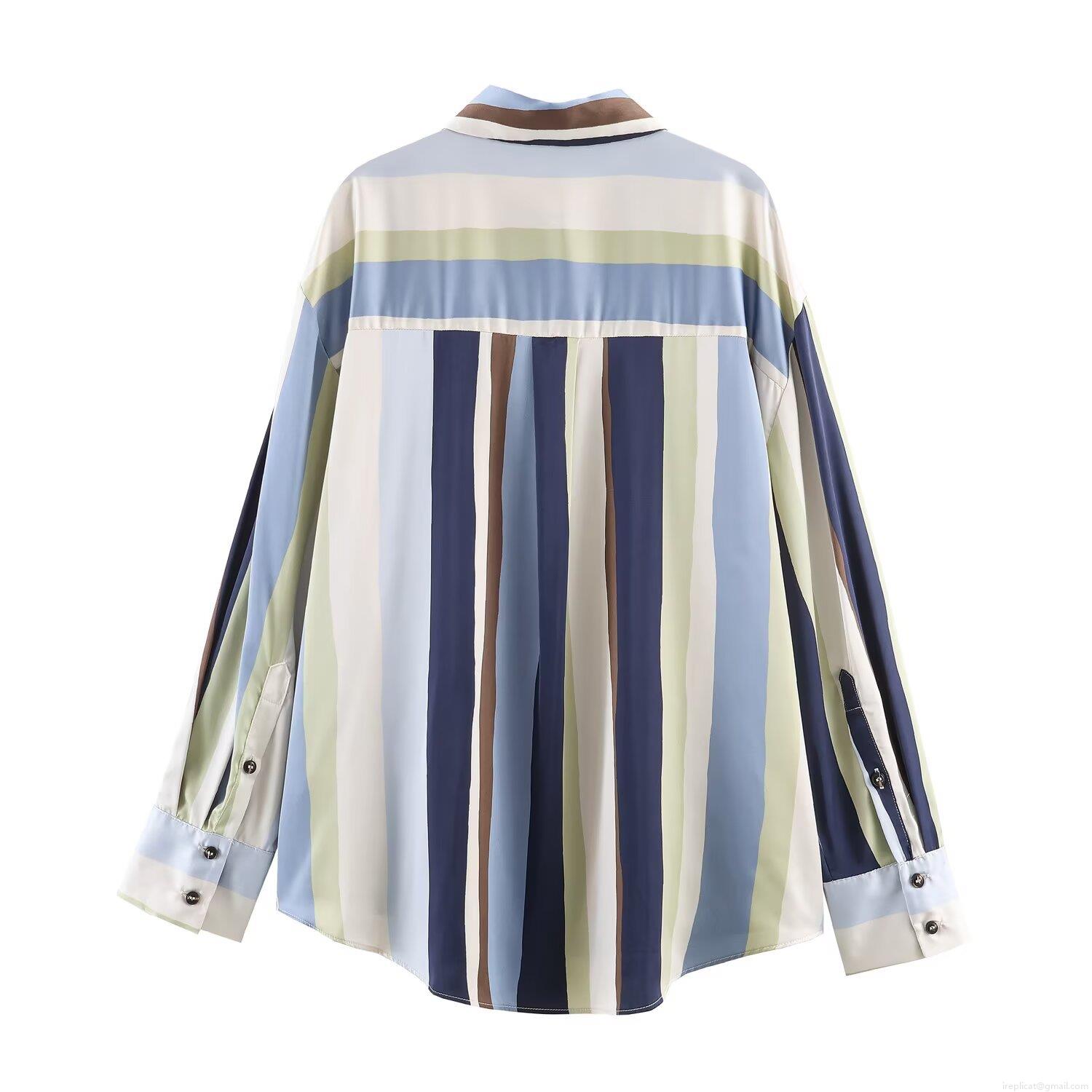 • Women's Long Sleeve Striped Blouse Polyester Cotton Blend Button Down Loose Fit Polo Collar Patchwork Satin Texture Casual Shirt Top