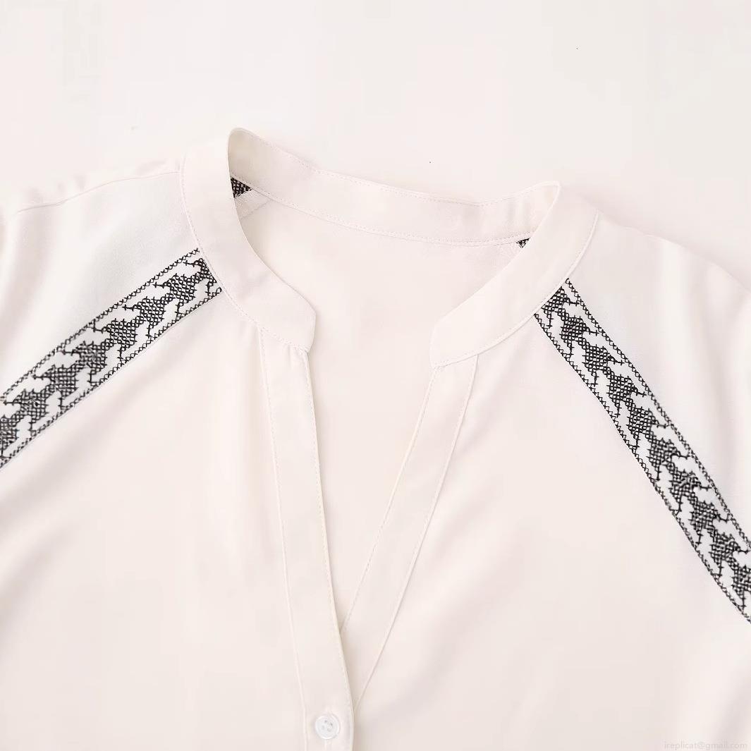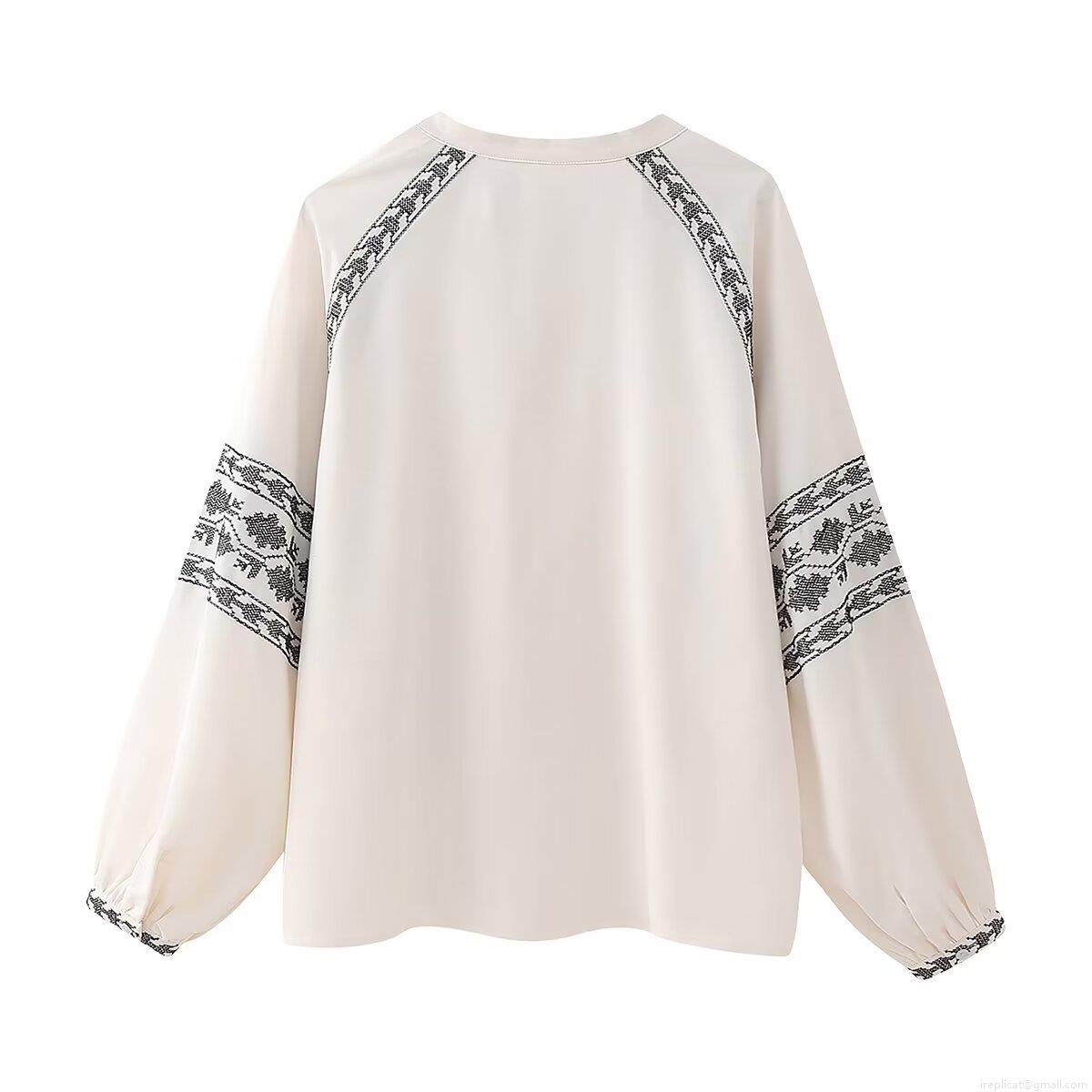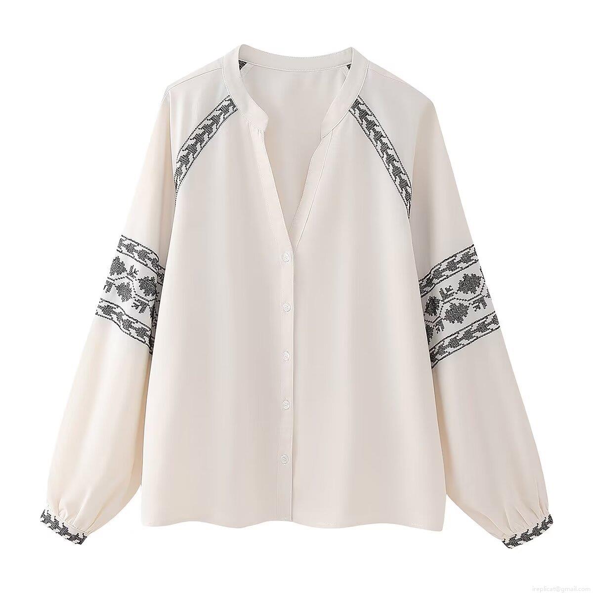 • Women's Long Sleeve V-Neck Embroidered Shirt Fashion Elegant Contrast Color Single Breasted Polyester Blouse Casual Tops For Women