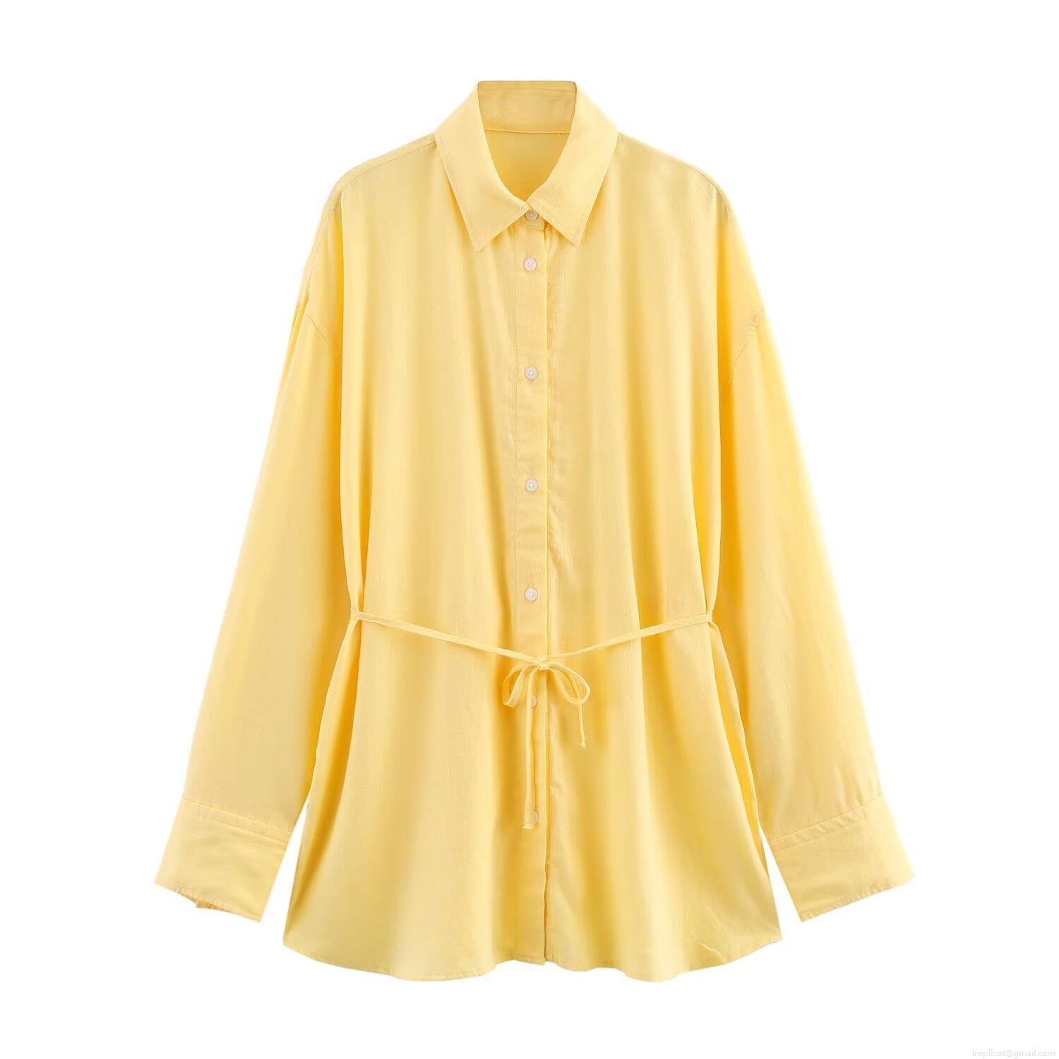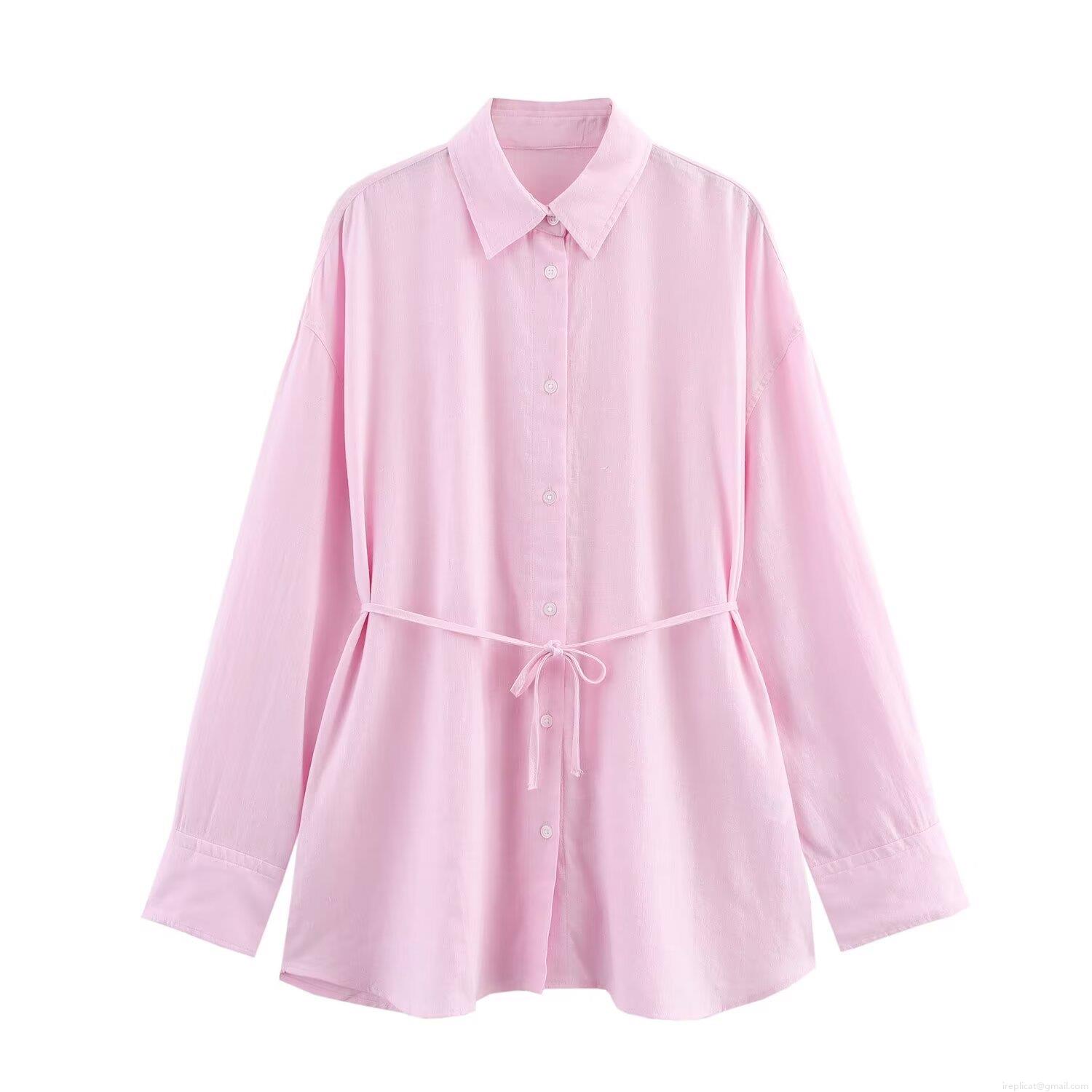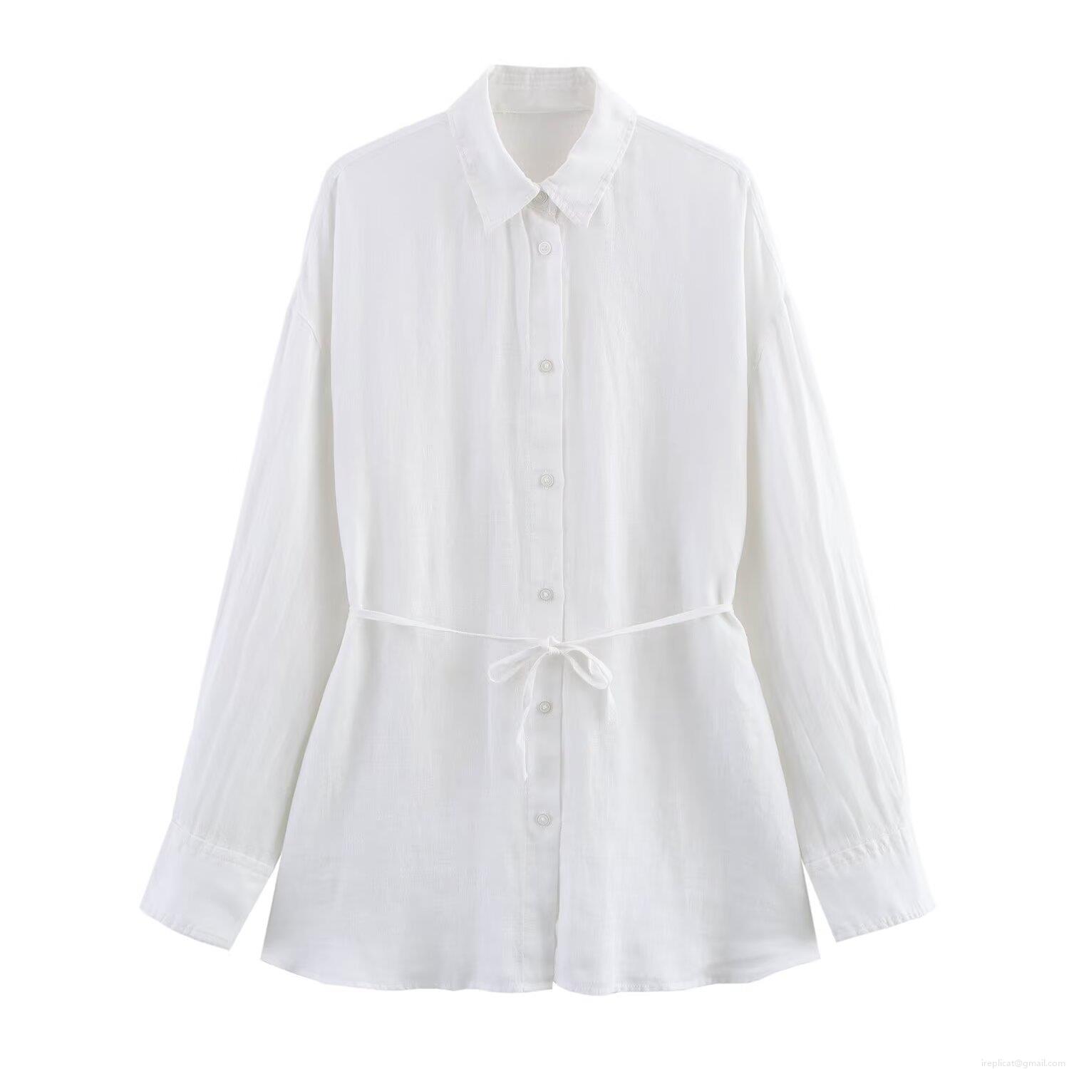 • Women's Loose Linen Polyester Blend Long Sleeve Shirt Solid Color Casual Tie Waist Button Down Blouse Lapel Tops For Streetwear Office