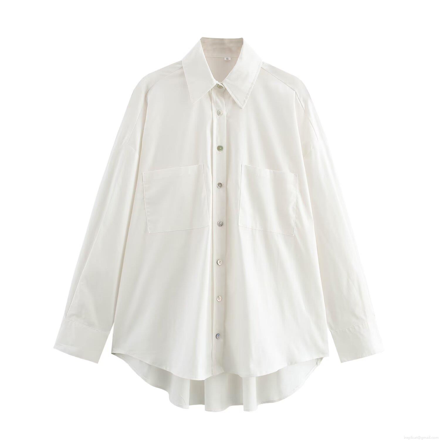 Women's Loose Long Sleeve Polyester Shirt Lapel Button Down Blouse With Pockets Casual Streetwear Solid White Top