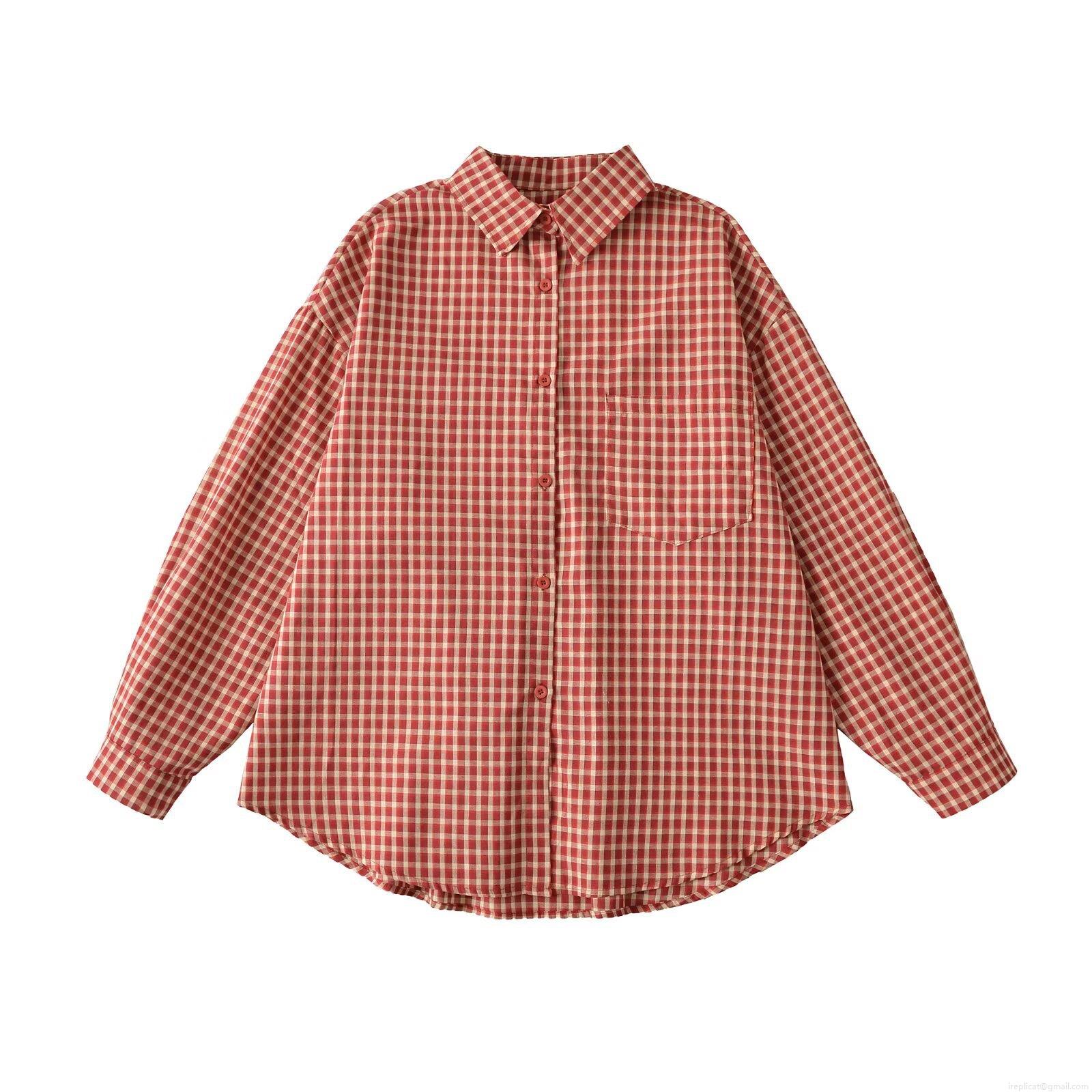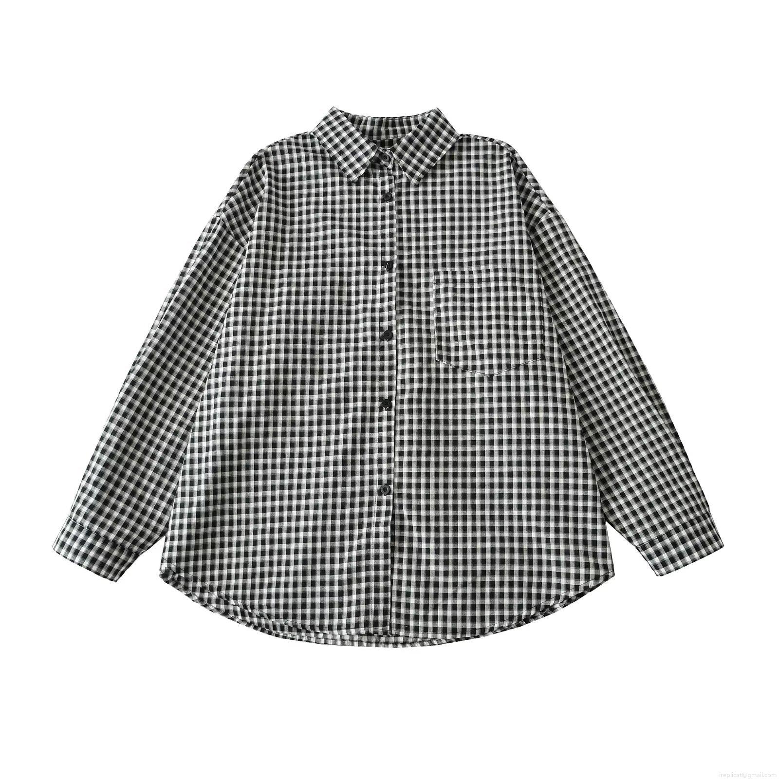 Women's Loose Plaid Checked Shirt Polyester Long Sleeve Lapel Button Down Blouse Street Style Casual Autumn Top For Women Fashionable Outerwear