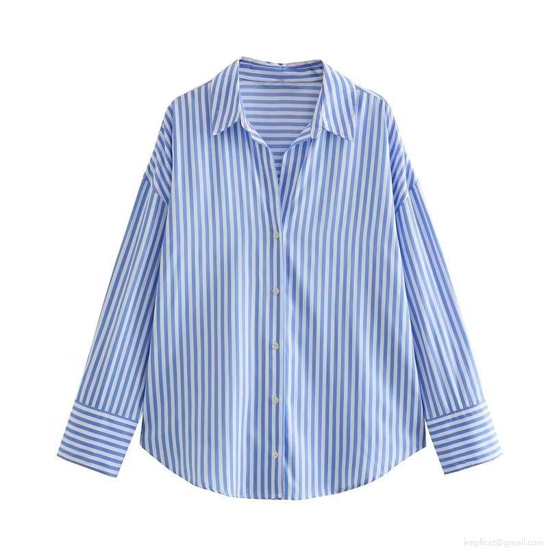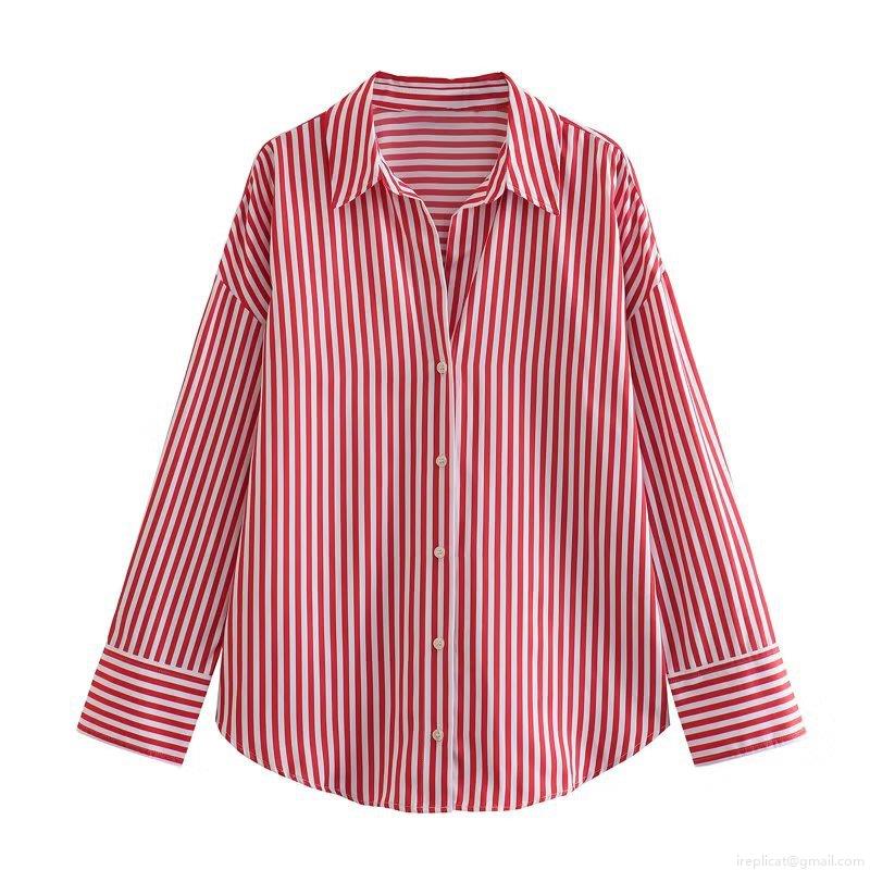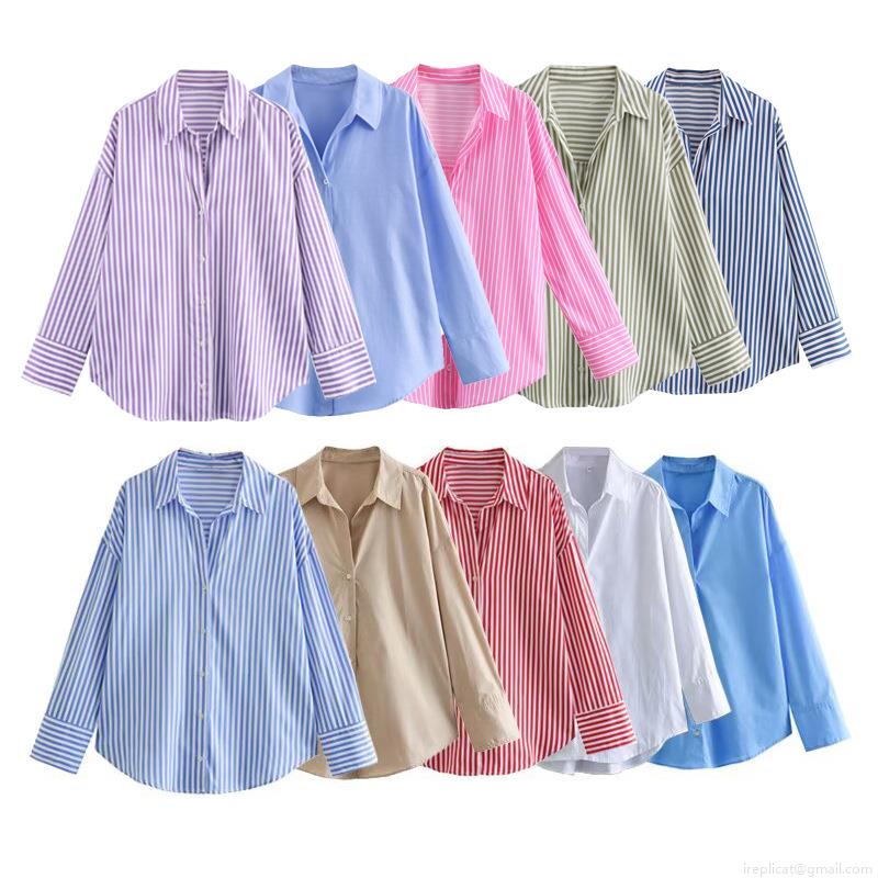• Women's Loose Poplin Striped Long Sleeve Shirt Button Down Lapel Oversized Blouse Streetwear Casual Office Top White Blue Red Khaki