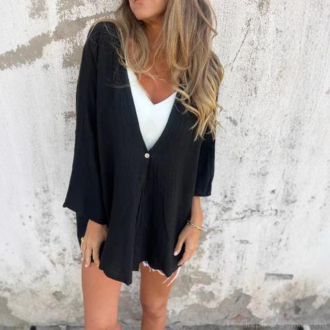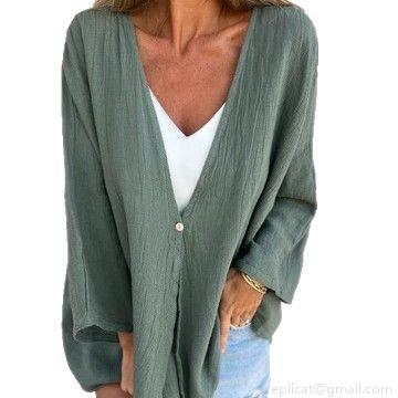 • Women's Loose V-Neck Long Sleeve Blouse Casual Solid Color Crinkle Texture Cardigan Top Polyester Spandex Single Button Shirt For Women Daily Commute Vacation