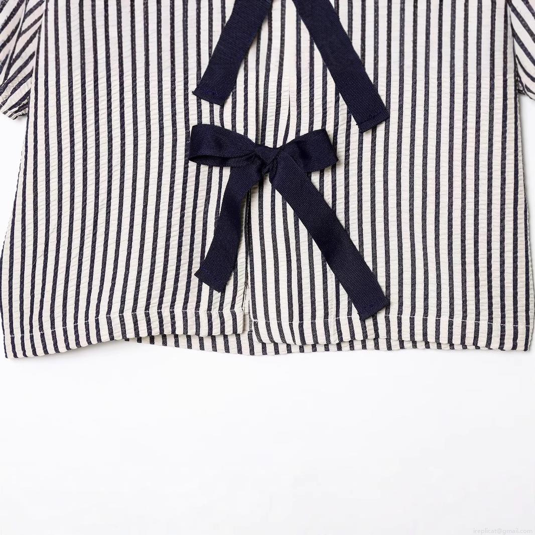 • Women's Navy White Striped V-Neck Puff Sleeve Blouse Sweet Short Sleeve Top With Bow Tie Front Seersucker Polyester Shirt For Daily Casual Vacation