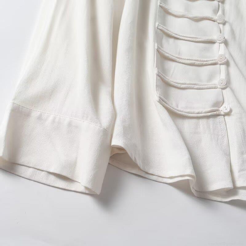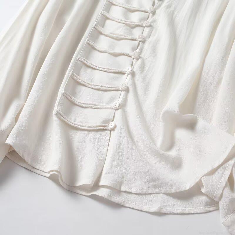 Women's New Chinese Style Blouse Viscose Linen Blend Stand Collar Frog Button Long Sleeve Shirt Elegant Solid White Top for Daily Office Wear