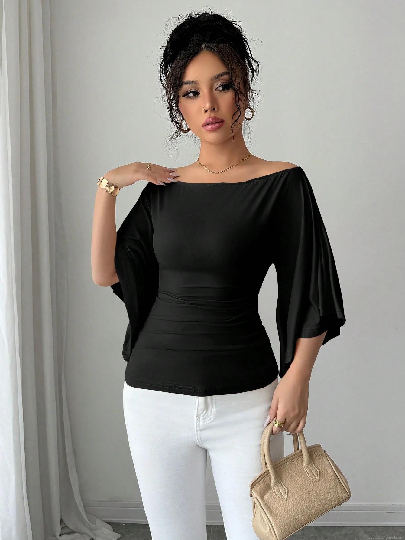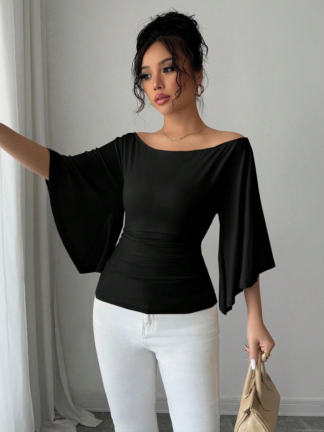 • Women's Off Shoulder Flare Sleeve Blouse 95% Polyester 5% Elastane Slim Fit Solid Color Top Elegant Retro Bodycon Shirt For Daily Party Date