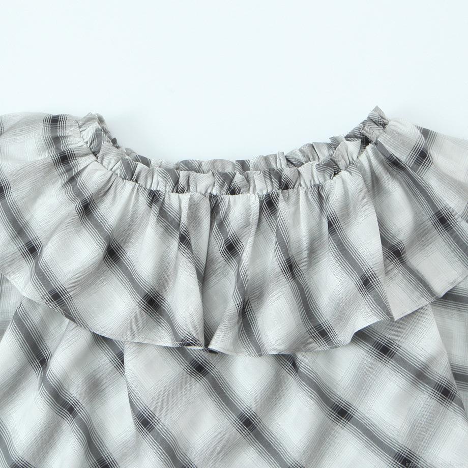 • Women's Off Shoulder Gingham Blouse Long Sleeve Ruffle Trim Tie Cuff Checked Crop Top Loose Casual Flare Sleeve Shirt