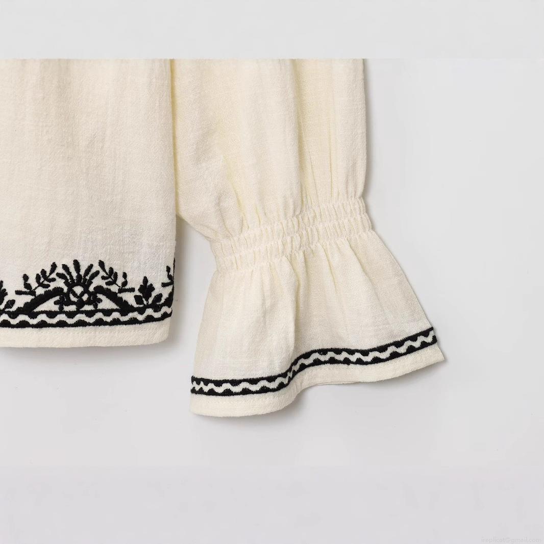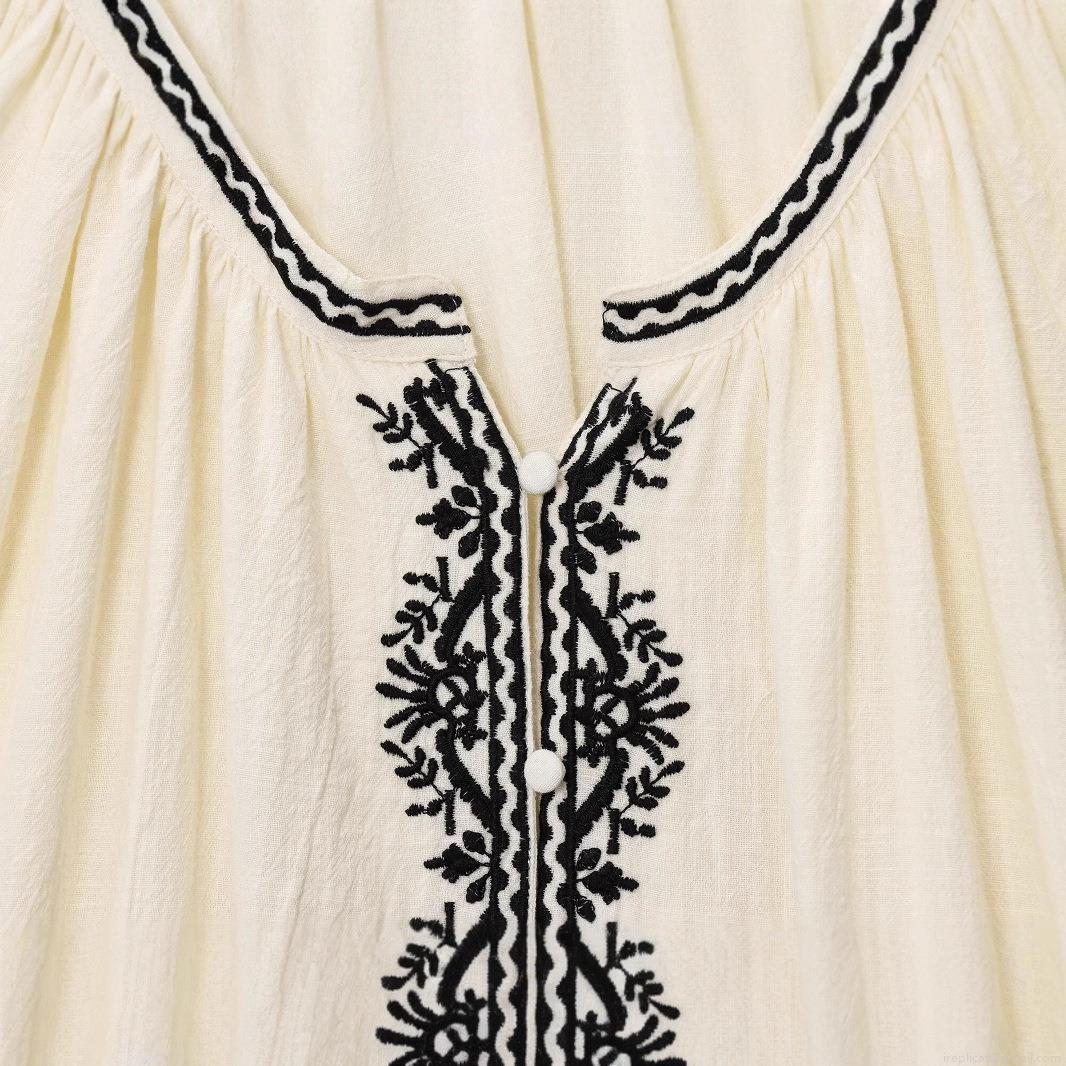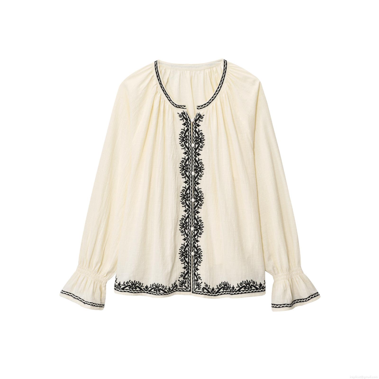 • Women's Off White Long Sleeve Blouse Polyester Blend Black Floral Embroidery Round Neck Flare Sleeve Boho Vintage Casual Summer Top Elegant Ethnic Blouse