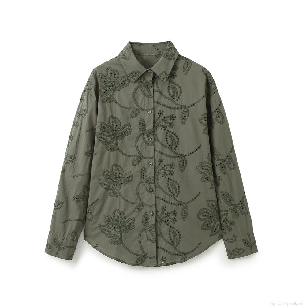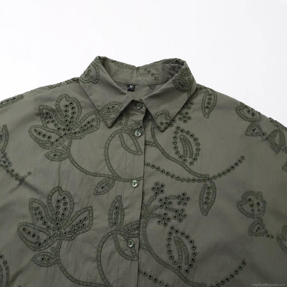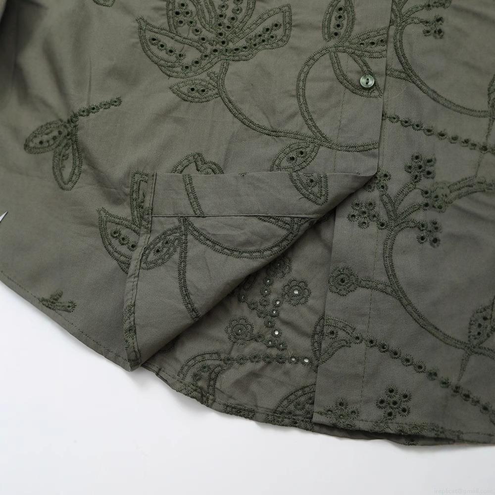 • Women's Olive Green Embroidery Hollow Out Long Sleeve Shirt Blouse 85% Cotton 15% Polyester Lapel Single Breasted Casual Vintage Elegant Tops