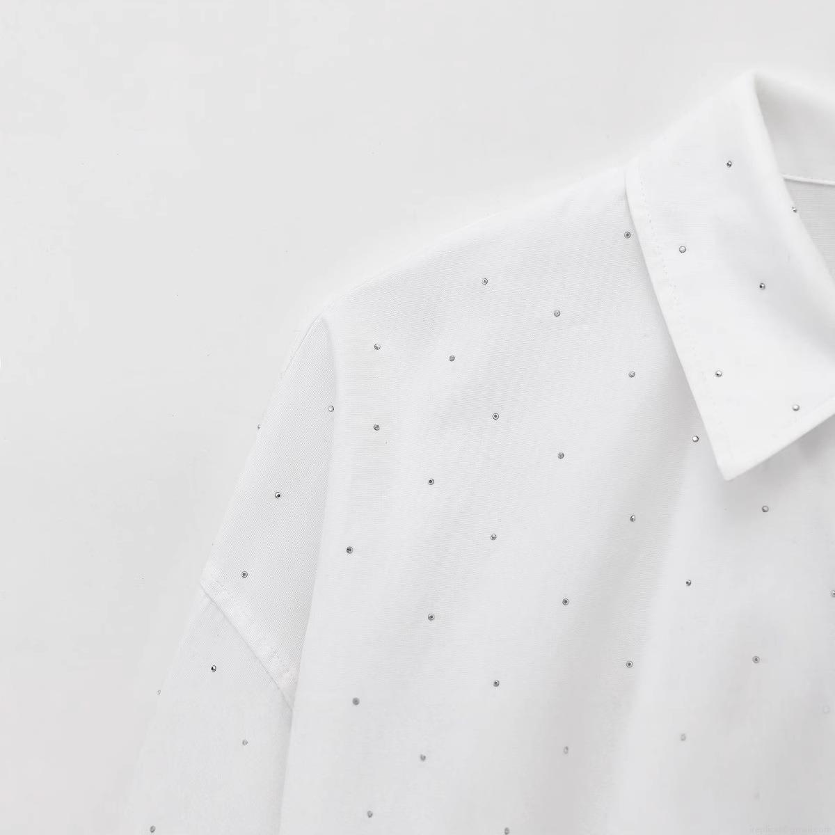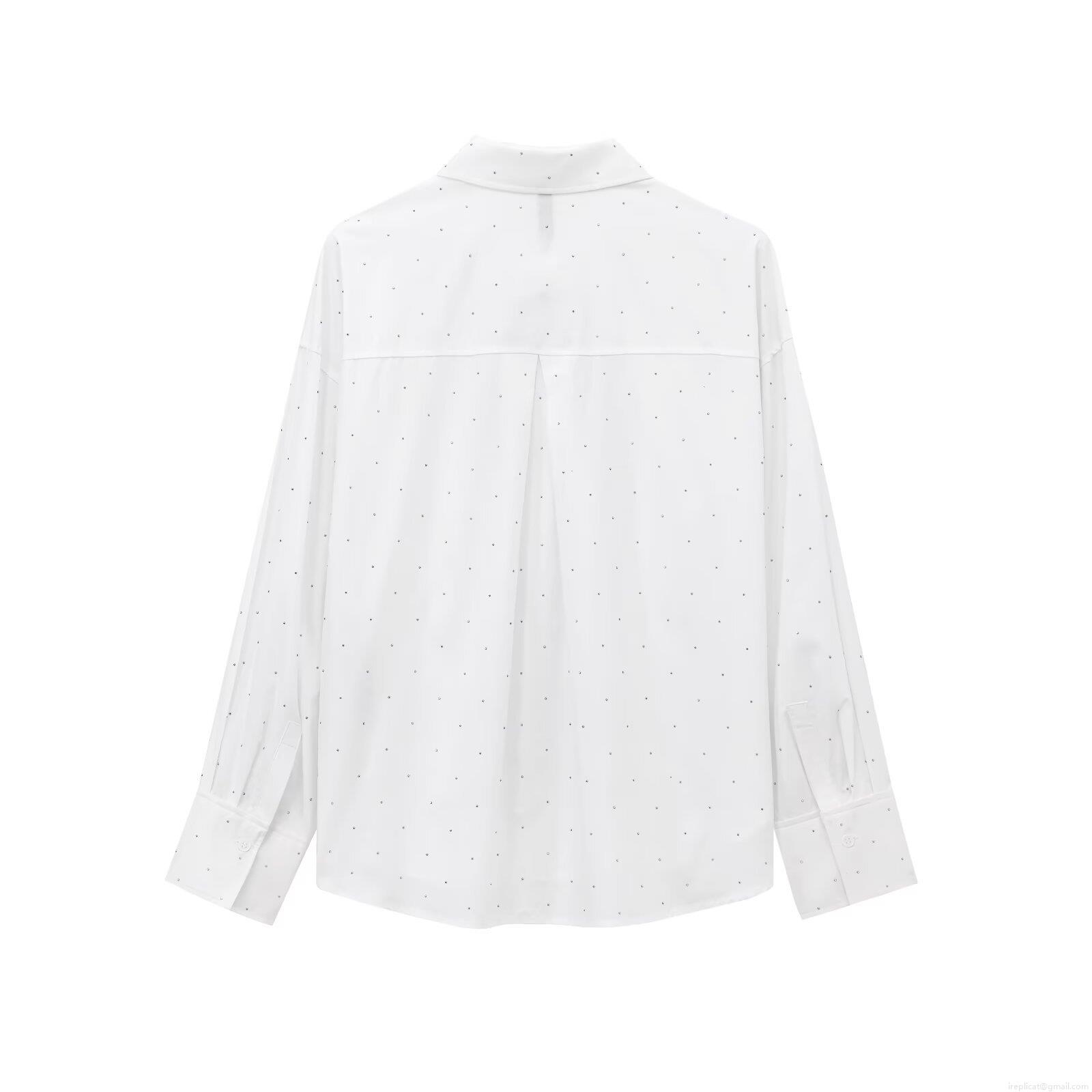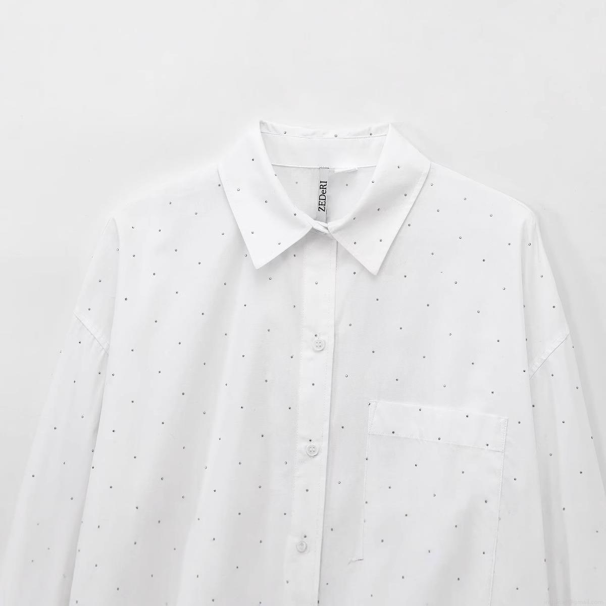 • Women's Oversized White Long Sleeve Button Down Shirt With Rhinestone Embellishments Polyester Polka Dot Blouse Top For Casual Streetwear Party