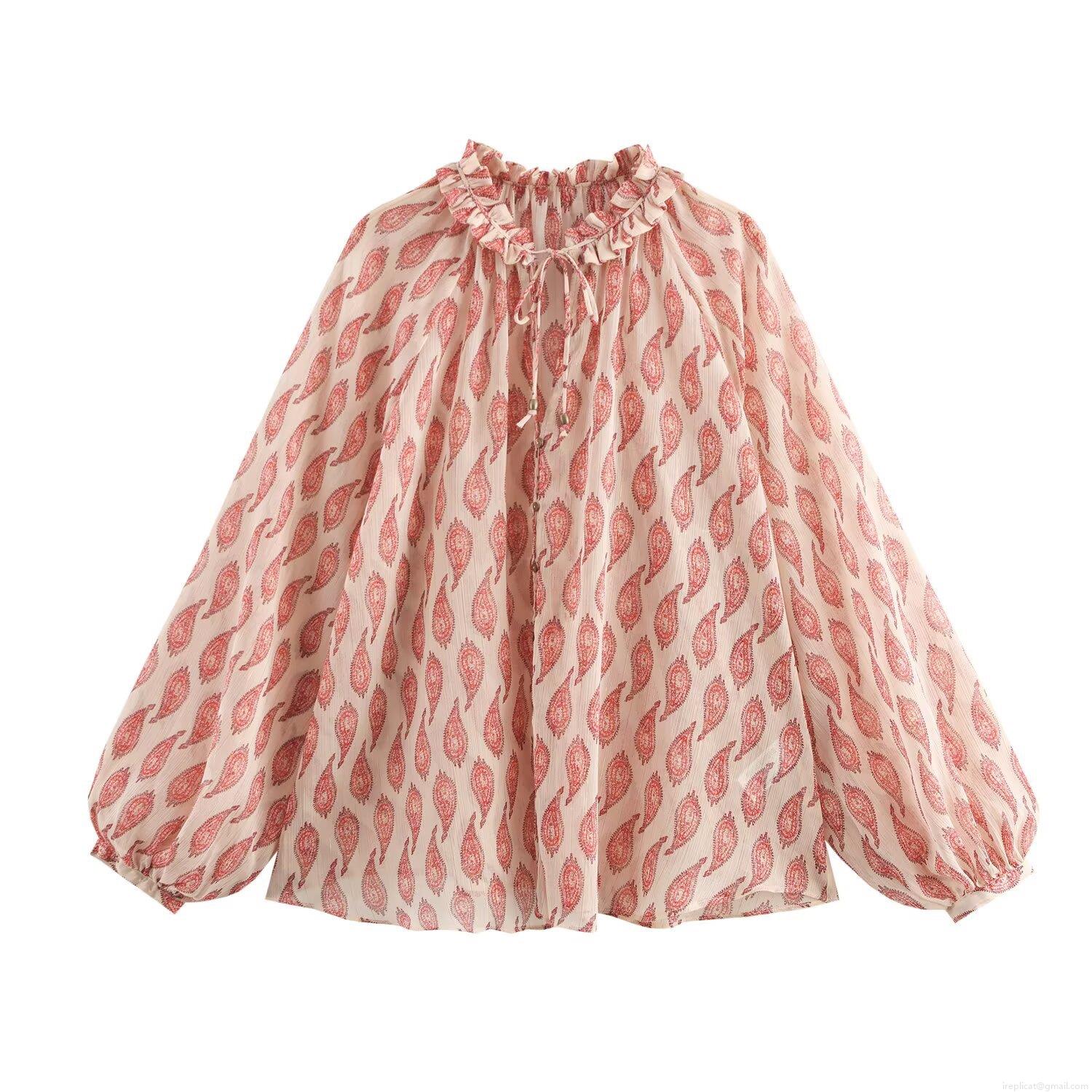• Women's Paisley Print Blouse With Metallic Thread Ruffled Tie Neck Long Lantern Sleeve Loose Casual Shirt Bohemian Vacation Tops