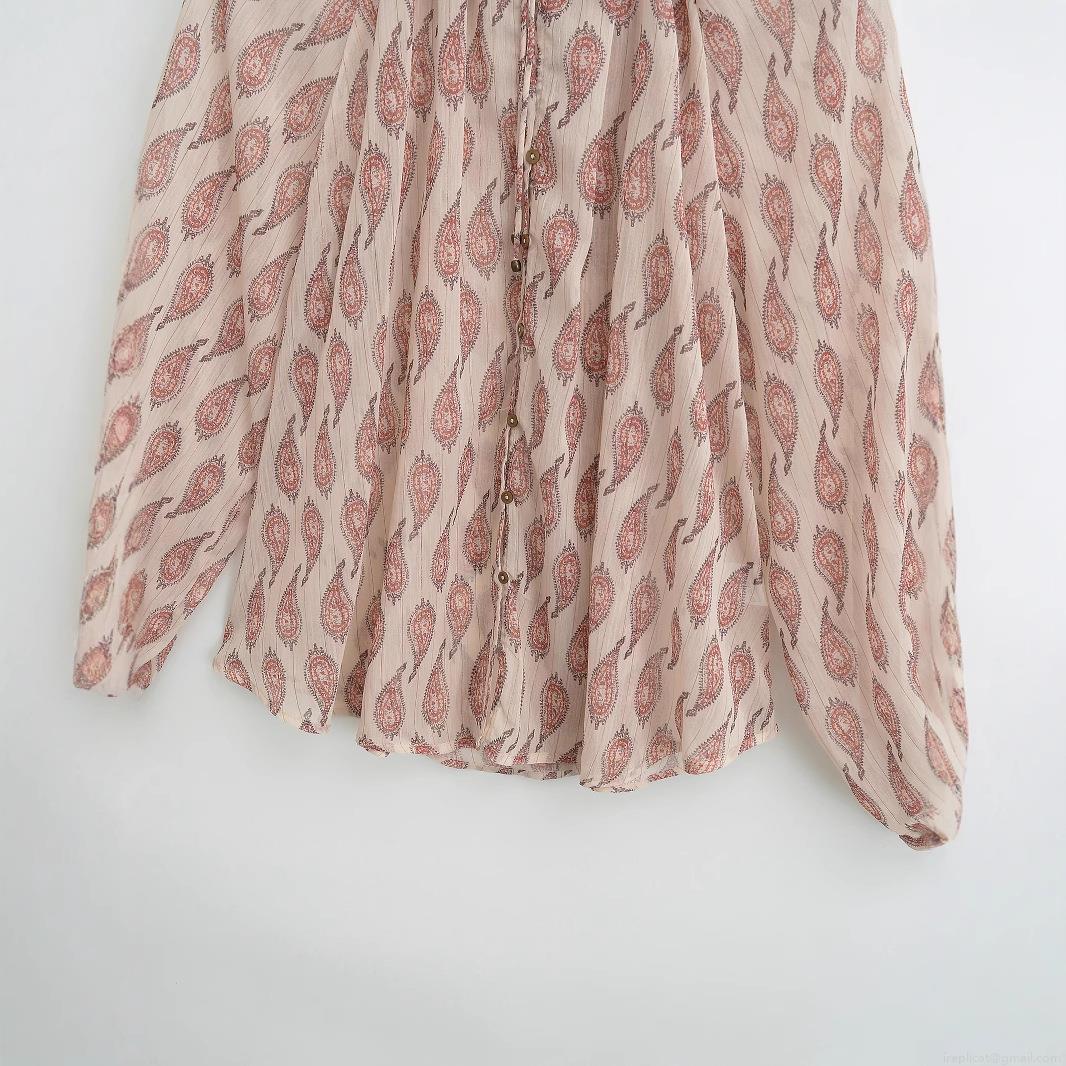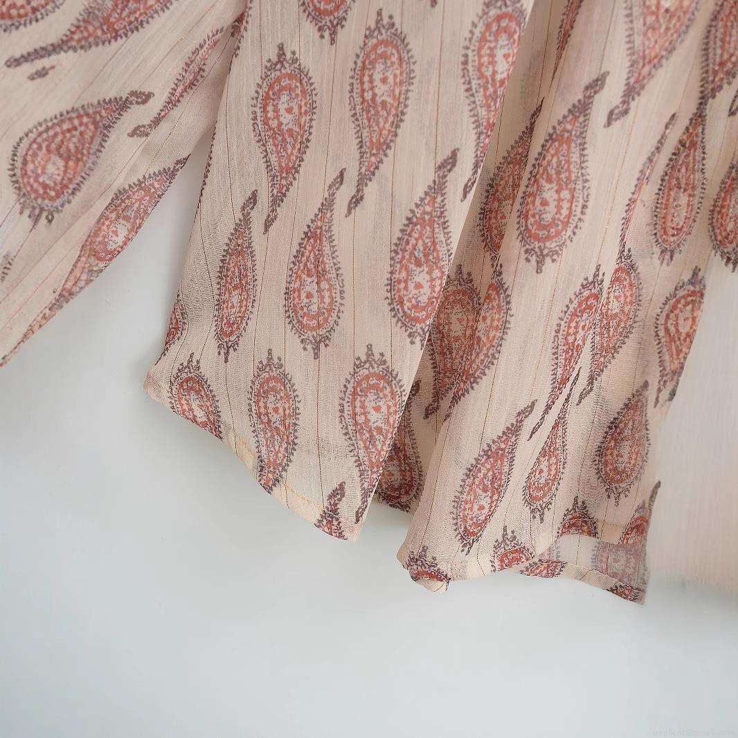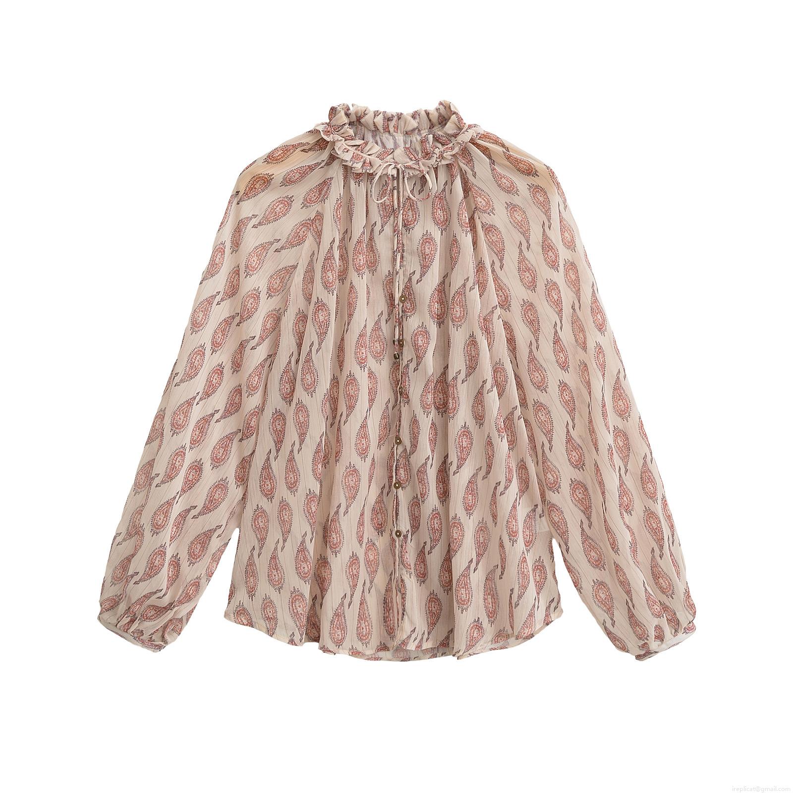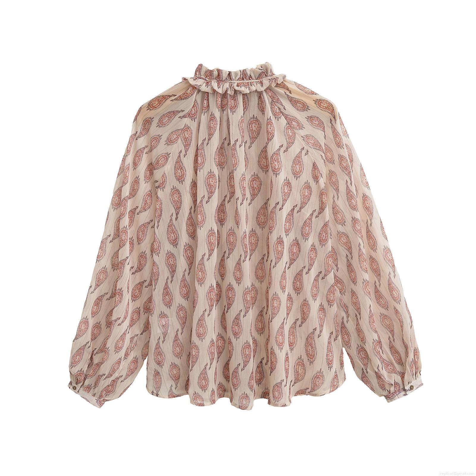 • Women's Paisley Print Chiffon Blouse With Gold Lurex Metallic Thread Ruffle Stand Collar Long Lantern Sleeve Single Breasted Casual Shirt Top