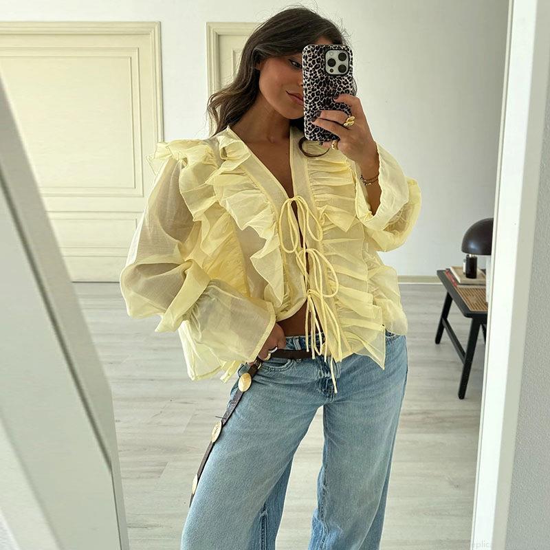 • Women's Pale Yellow Tiered Ruffle Blouse Vintage Tie-Front Long Flare Sleeve Sheer Chiffon Top For Dating Daily Wear