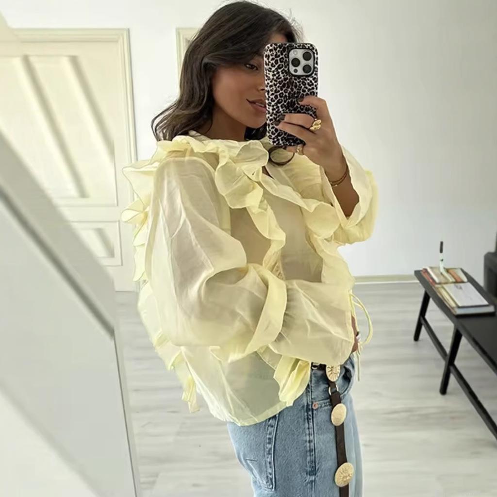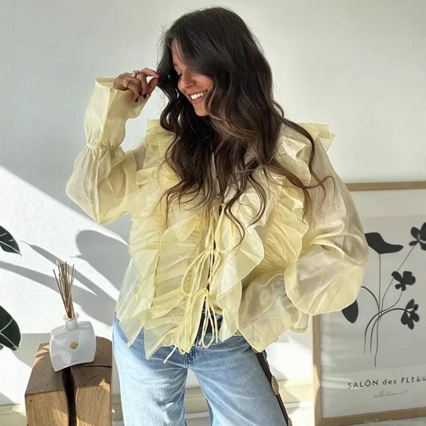 Women's Pale Yellow Tiered Ruffle Blouse Vintage Tie-Front Long Flare Sleeve Sheer Chiffon Top For Dating Daily Wear