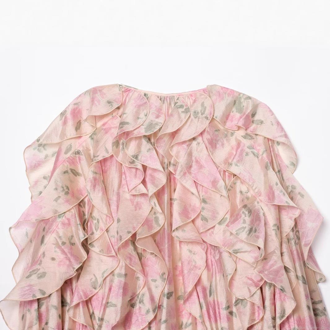 Women's Pink Floral Chiffon Blouse Elegant Multi Layered Ruffle Long Sleeve Shirt Sweet Lace Up Round Neck Casual Party Top For Ladies