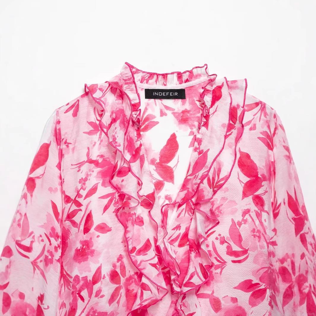 Women's Pink Floral Print Polyester Blouse Elegant V-Neck Ruffle Long Lantern Sleeve Top For Daily Dating Sweet Style Shirts